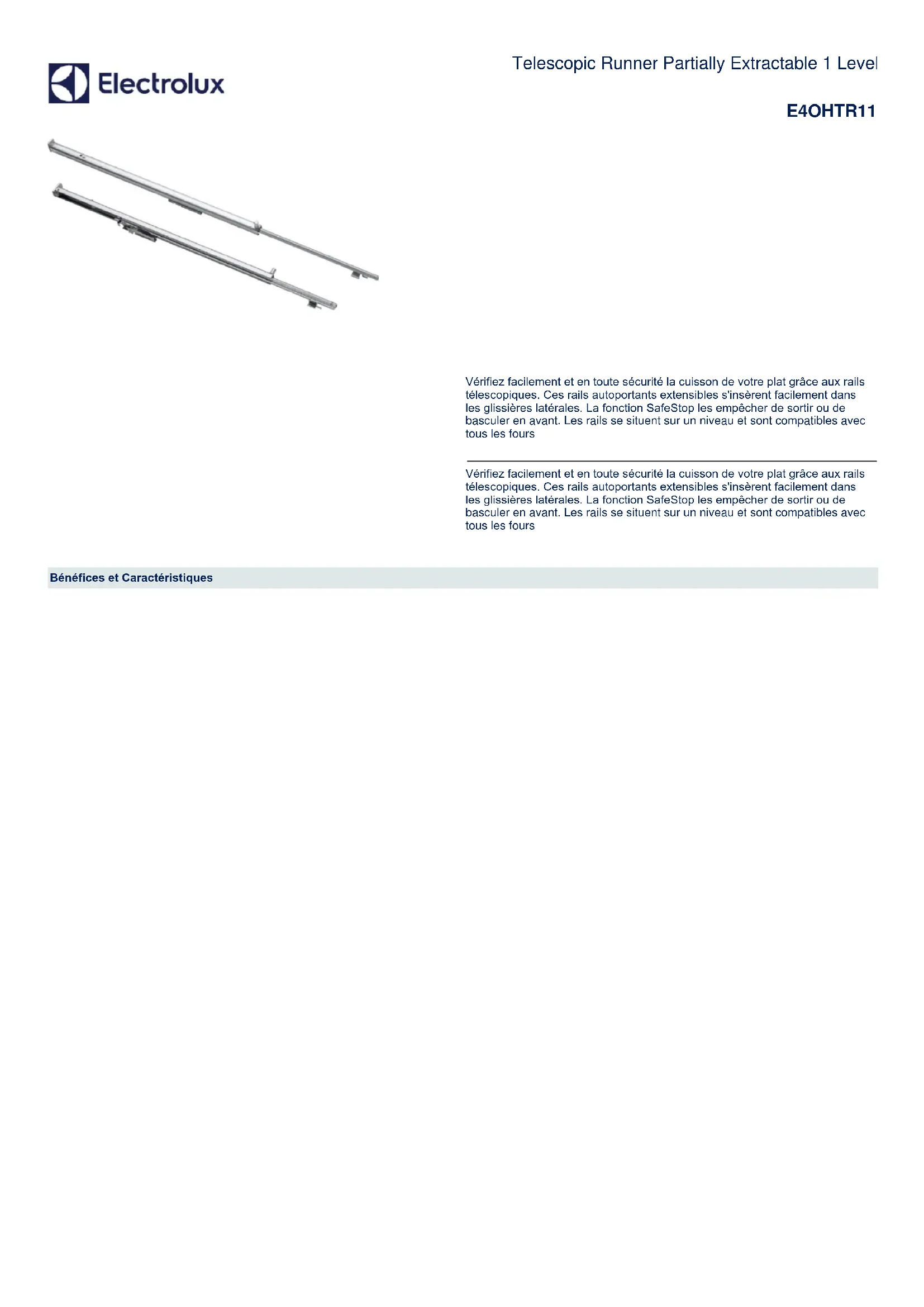 Vérifiez facilement et en toute sécurité la cuisson de votre plat grâce aux rails télescopiques. Ces rails autoportants extensibles s'insèrent facilement dans les glissières latérales. La fonction SafeStop les empêcher de sortir ou de basculer en avant. Les rails se situent sur un niveau et sont compatibles avec tous les fours Vérifiez facilement et en toute sécurité la cuisson de votre plat grâce aux rails télescopiques. Ces rails autoportants extensibles s'insèrent facilement dans les glissières latérales. La fonction SafeStop les empêcher de sortir ou de basculer en avant. Les rails se situent sur un niveau et sont compatibles avec tous les fours Bénéfices et Caractéristiques Telescopic Runner Partially Extractable 1 Level