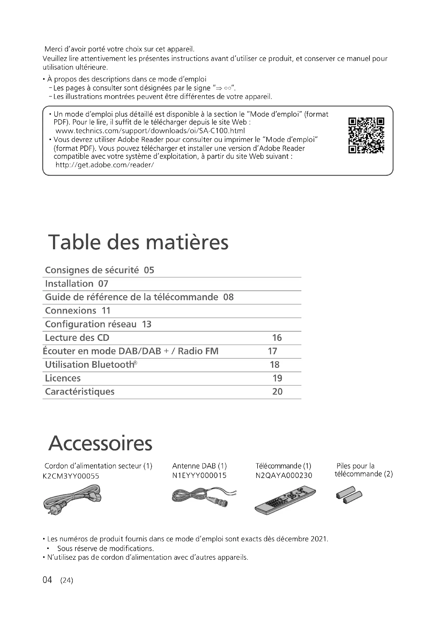 - Vous devrez utiliser Adobe Reader pour consulter ou imprimer le “Mode d’emploi” (format PDF). Vous pouvez télécharger et installer une version d’Adobe Reader compatible avec votre système d’exploitation, à partir du site Web suivant : http://get.adobe.com/reader/ Table des matières Consignes de sécurité 05 Installation 07 Guide de référence de la télécommande 08 Connexions 11 Configuration réseau 13 Lecture des CD 16 Écouter en mode DAB/DAB + / Radio FM 17 Utilisation Bluetooth