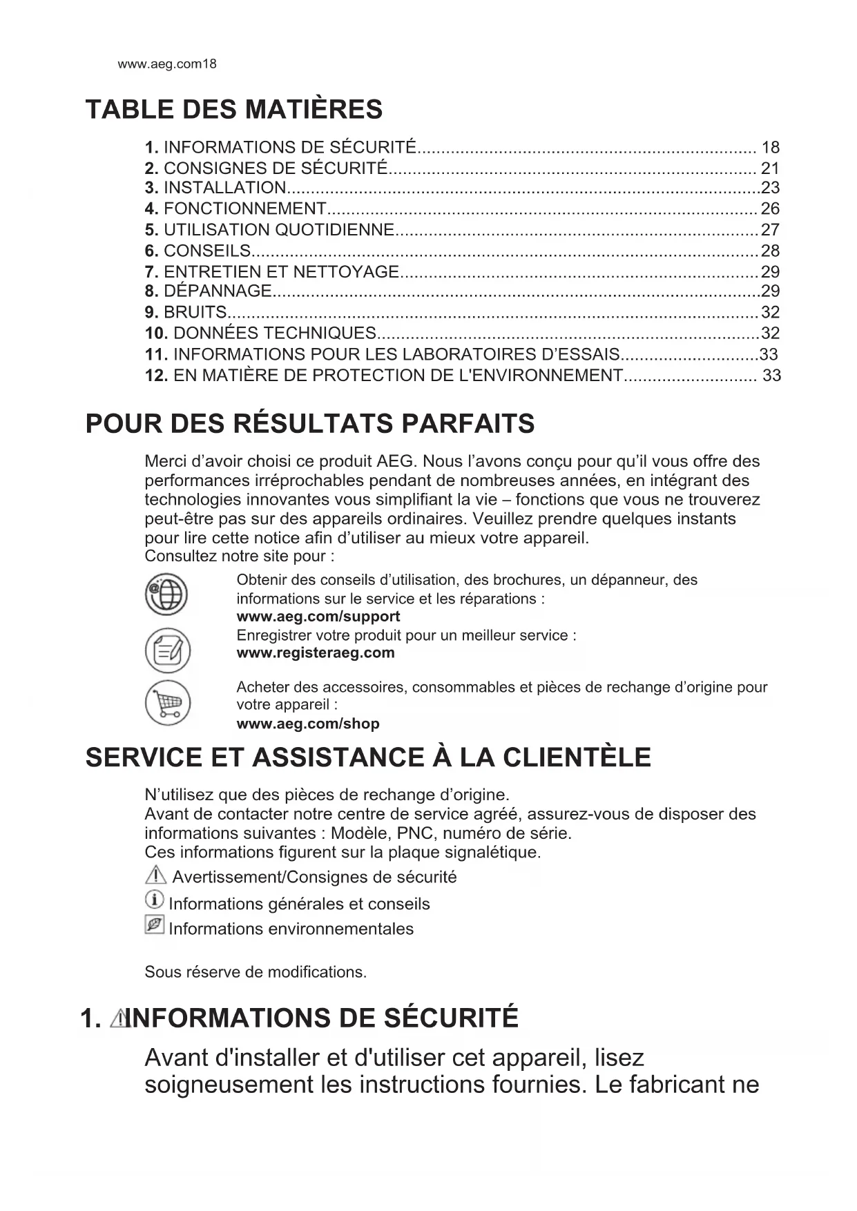 Avant d'installer et d'utiliser cet appareil, lisez soigneusement les instructions fournies. Le fabricant ne www.aeg.com18pourra être tenu pour responsable des blessures et dégâts résultant d'une mauvaise installation ou utilisation. Conservez toujours les instructions dans un lieu sûr et accessible pour vous y référer ultérieurement.