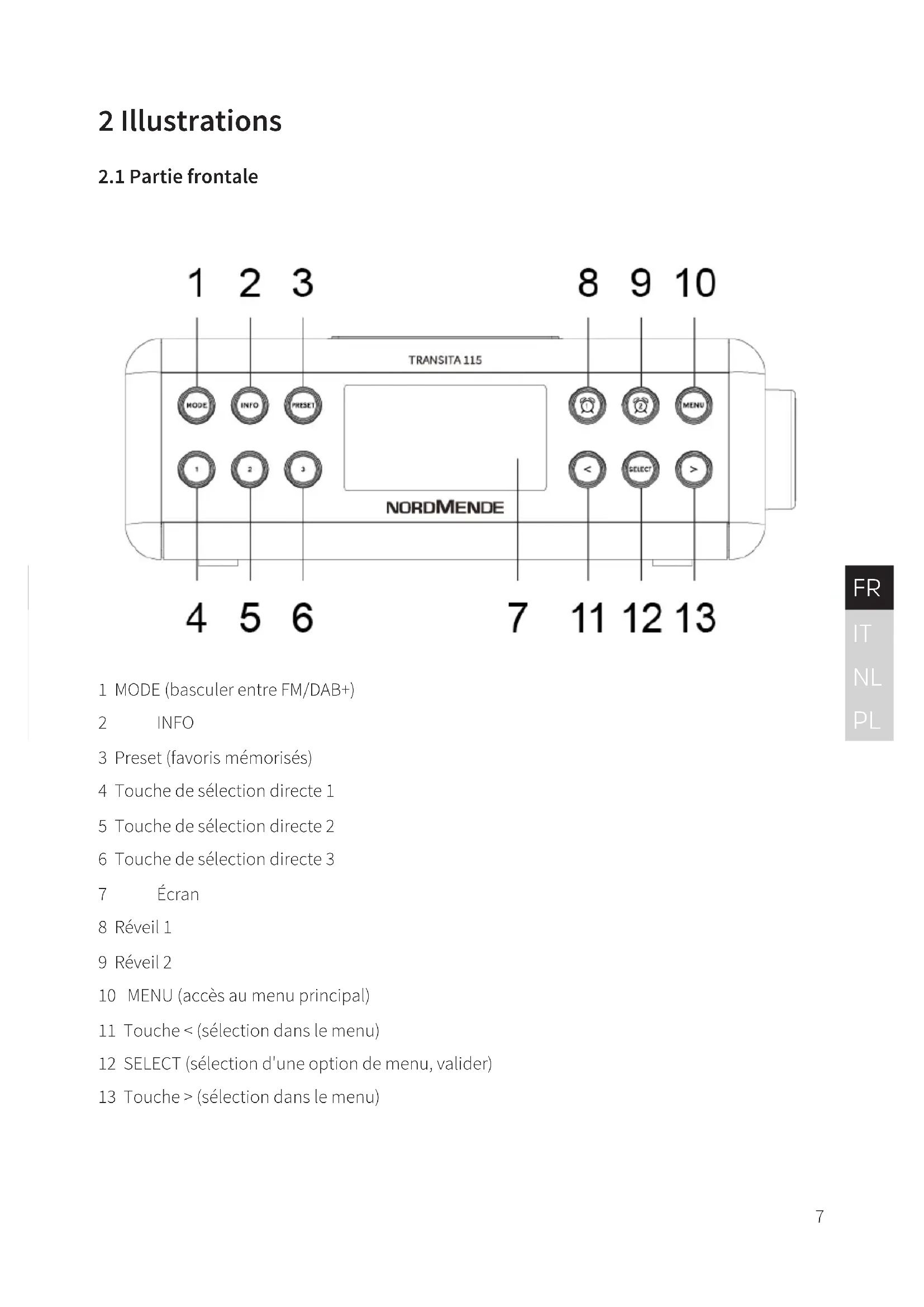 1 MODE (basculer entre FM/DAB+) 2 INFO 3 Preset (favoris mémorisés) 4 Touche de sélection directe 1 5 Touche de sélection directe 2 6 Touche de sélection directe 3 7 Écran 8 Réveil 1 9 Réveil 2 10 MENU (accès au menu principal) 11 Touche < (sélection dans le menu) 12 SELECT (sélection d'une option de menu, valider) 13 Touche > (sélection dans le menu)8