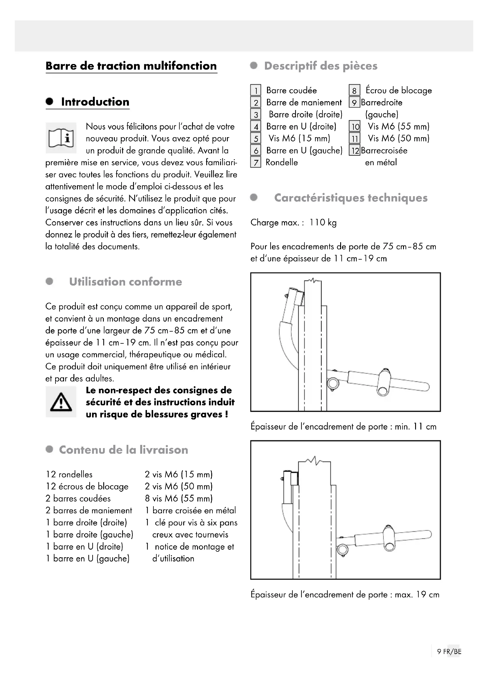 Barre croisée en métal Caractéristiques techniques Charge max. : 110 kg Pour les encadrements de porte de 75 cm–85 cm et d‘une épaisseur de 11 cm–19 cm Épaisseur de l‘encadrement de porte: min. 11 cm Épaisseur de l‘encadrement de porte: max. 19 cm10 FR/BE Consignes de sécurité VEUILLEZ LIRE LE MODE D‘EMPLOI AVANT