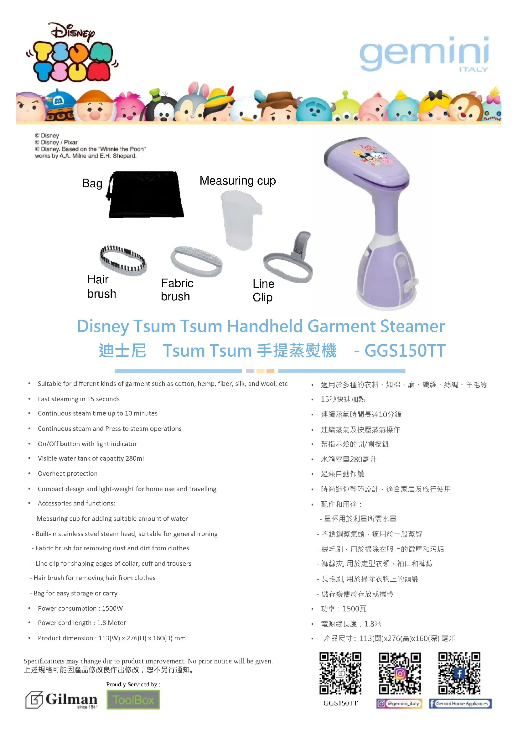 | Caractéristiques techniques | Nettoyeur à vapeur GEMINI GGS150TT, puissance de 1500 W, pression de vapeur de 3,5 bars, réservoir de 1,5 L, temps de chauffe de 5 minutes. |