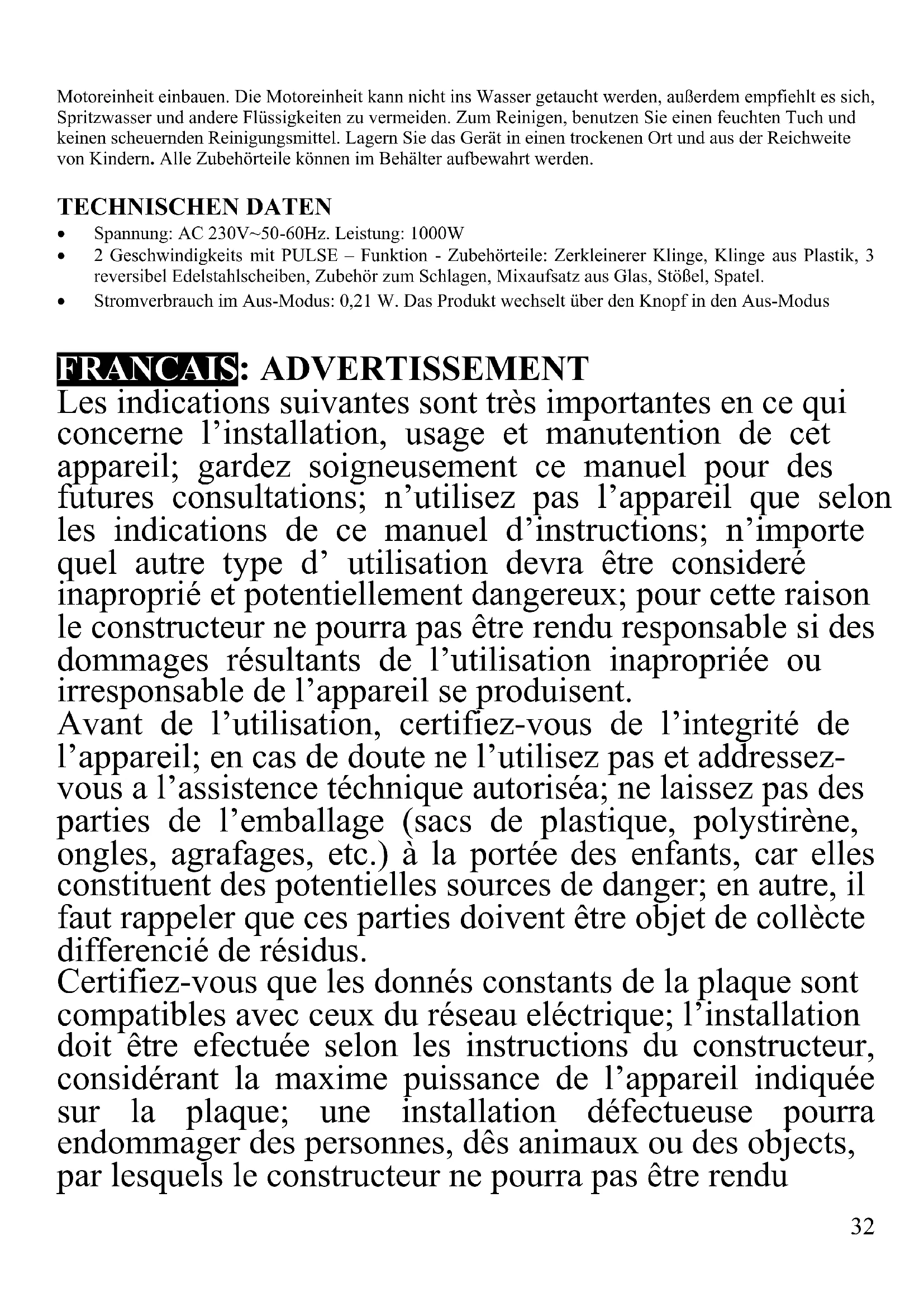 L'unité est équipée de 3 disques réversibles en acier inoxydable pour trancher, déchirer, râper, pour légumes julienne et frites. Inverser la position du disque permet l'une des fonctions ci-dessus. Utilisez ces accessoires avec des vitesses baisses. - Assurez-vous que l'appareil est débranché. - Placez le récipient (5) sur le dessus de l'unité motrice (8) et verrouillez-le en le tournant dans le sens des aiguilles de la montre. (Fig. 1 et 2). - Installez l'un des disques (11) sur le haut de la transmission (4) (3 et 4). - Fermez le couvercle (Fig. 5 et 6).et branchez l'appareil à la prise de courant. - Introduire les aliments dans le trou du couvercle (2) à l'aide du pressoir à aliments (Fig 7). FOUET / EMULSION Utilisez l'accessoire (3) indiqué sur la figure pour fouetter la crème ou les œufs, ou pour émulsionner. Suivez les instructions du paragraphe «Couper / mélanger», en assemblant l'accessoire de fouettage (3) au lieu des lames de hachage (10). Utilisez à haute vitesse. MIXEUR L'appareil comprend un mélangeur avec una capacité de 1,5 litres, pour mélanger, secouer, etc... - Assurez-vous que la fiche est déconnectée de la prise électrique. - Placez le bocal déjà monté (14) sur le dessus de l'unité motrice (8) et verrouillez-le en le tournant dans le sens des aiguilles de la montre (1 et 2). - Mettez les aliments dans le bocal sans dépasser la capacité maximale; Fermez le couvercle. (3 et 4). - Branchez l'appareil. Utilisez le bouton de contrôle pour sélectionner la vitesse; l'appareil s'allume. OPTION PULSE Mettez le bouton de vitesse sur la position "PULSE" pour travailler à pleine vitesse. Mettre le bouton dans cette position augmentera immédiatement la vitesse jusqu'au niveau maximal.38 NETTOYAGE - ATTENTION: Nettoyage et enlèvement des accessoires uniquement lorsque l'appareil est déconnecté de la prise de courant. Les accessoires, le récipient, le mélangeur, le couvercle et les lames peuvent être traités comme de la vaisselle normale et lavés à l'eau chaude. Avant de les remonter sur l'unité motrice, séchez-les complètement. Le moteur ne peut pas être mis dans l'eau. Évitez les éclaboussures de liquides. Nettoyez-le avec un chiffon humide et un détergent doux. Conservez-le dans un endroit sec et hors de la portée des enfants. Tous les accessoires peuvent être rangés à l'intérieur du conteneur.