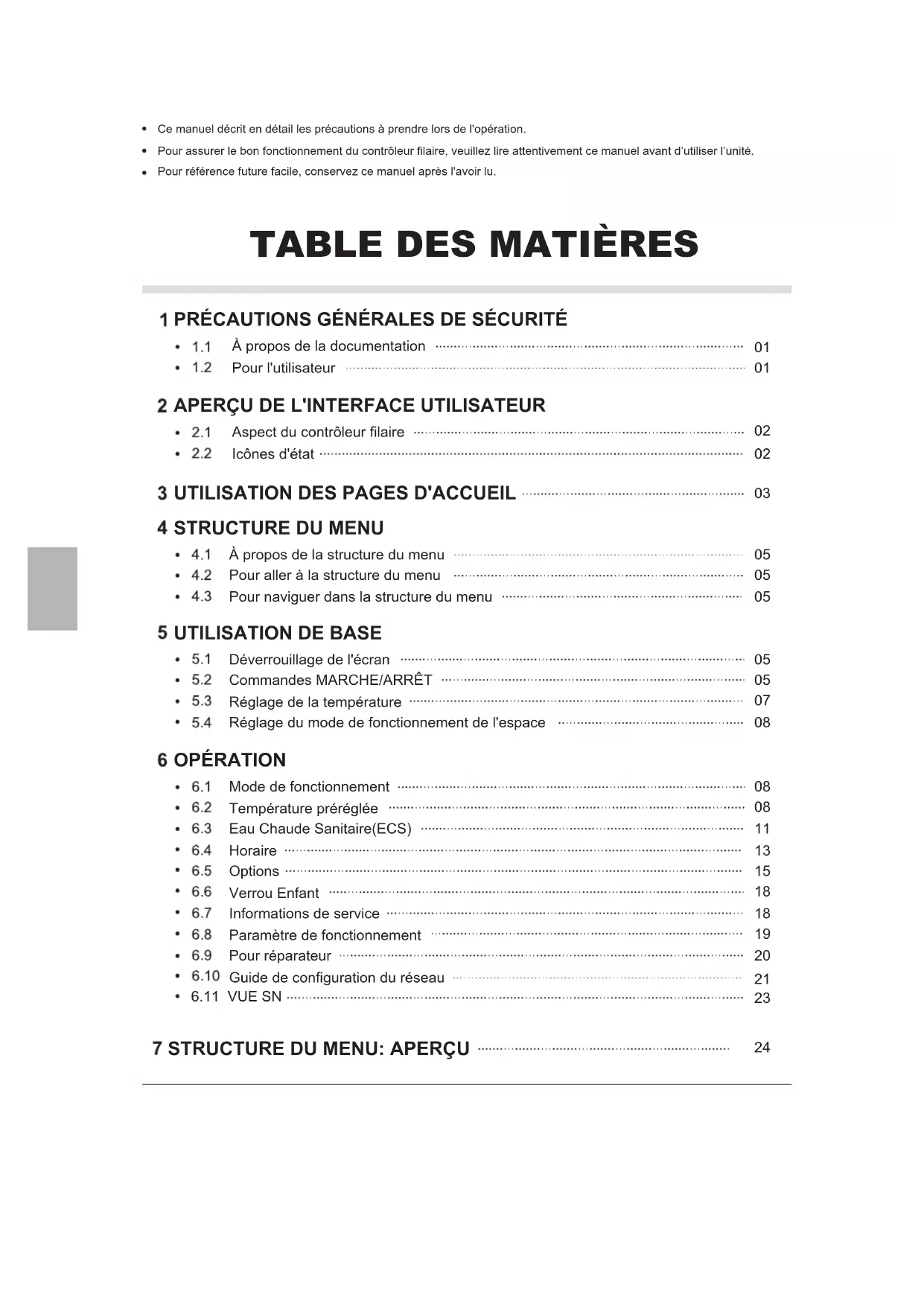 À propos de la documentation Pour l'utilisateur Aspect du contrôleur filaire Icônes d'état À propos de la structure du menu Pour aller à la structure du menu Pour naviguer dans la structure du menu Déverrouillage de l'écran Commandes MARCHE/ARRÊT Réglage de la température Réglage du mode de fonctionnement de l'espace Mode de fonctionnement Température préréglée Eau Chaude Sanitaire(ECS) Horaire Options Verrou Enfant Informations de service Paramètre de fonctionnement Pour réparateur Guide de configuration du réseau PRÉCAUTIONS GÉNÉRALES DE SÉCURITÉ