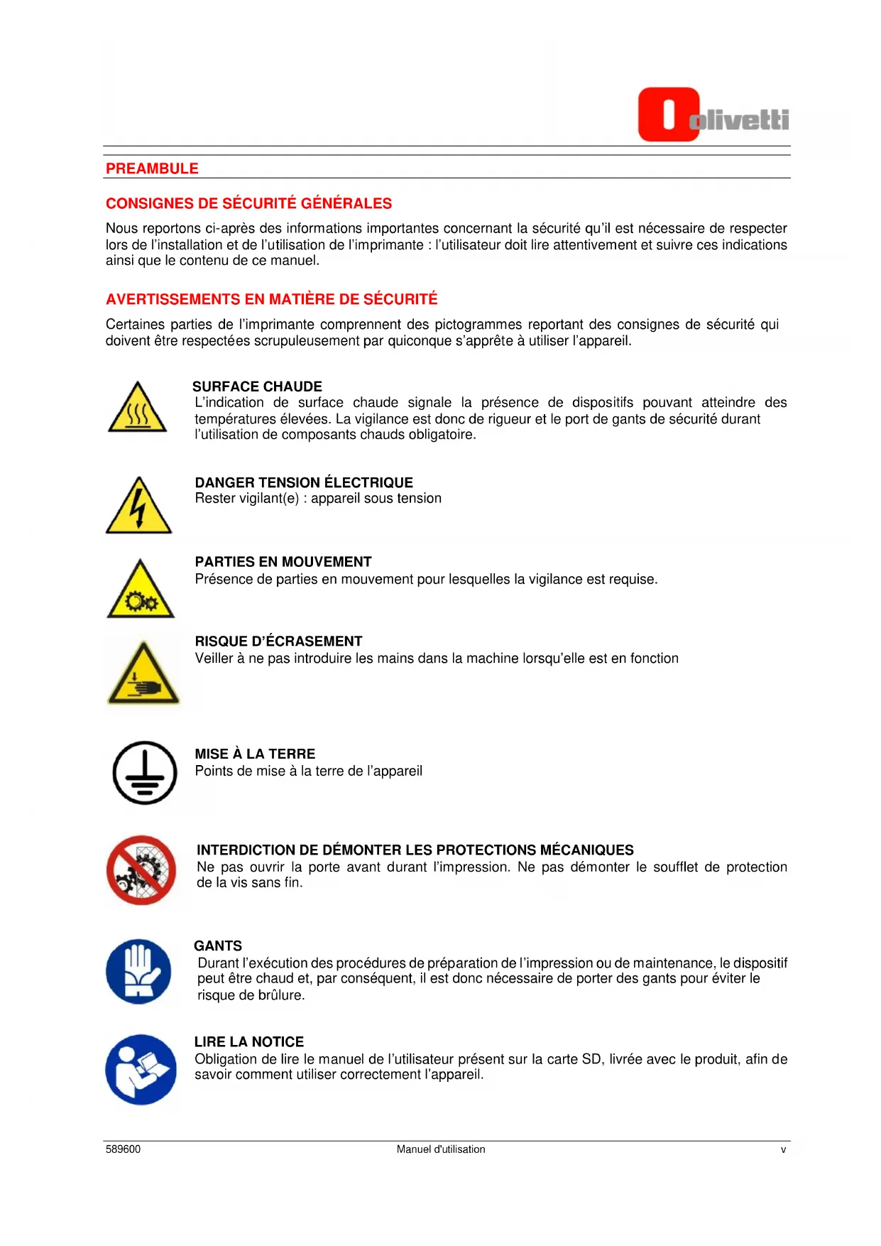 ANNEXE A - ÉTIQUETAGE OLIVETTI S2 ............................................................................................ A-1 POSITION ET SIGNIFICATION DES ETIQUETTES ............................................................................. A-1 ANNEXE B - ENTRETIEN ET MAINTENANCE DE L’IMPRIMANTE OLIVETTI S2 ............................ B-1 Entretien du plan d’impression ........................................................................................................... B-1 Lubrification des axes et de l’écrou .................................................................................................... B-1 Entretien des alimentateurs ............................................................................................................... B-1 Remplacement et entretien des buses d’impression ......................................................................... B-2 ANNEXE C – SCHEMA ELECTRIQUE ................................................................................................. C-1 ANNEXE D - MATERIAUX COMPATIBLES AVEC L’IMPRIMANTE OLIVETTI S2 ............................ D-1 Températures de travail ..................................................................................................................... D-2 ANNEXE E – FICHIERS CONTENUS DANS LA CARTE SD ............................................................... E-1 INFORMATIONS SUR L’ELIMINATION DU PRODUIT ......................................................................... F-1589600 Manuel d'utilisation v PREAMBULE CONSIGNES DE SÉCURITÉ GÉNÉRALES Nous reportons ci-après des informations importantes concernant la sécurité qu’il est nécessaire de respecter lors de l’installation et de l’utilisation de l’imprimante : l’utilisateur doit lire attentivement et suivre ces indications ainsi que le contenu de ce manuel. AVERTISSEMENTS EN MATIÈRE DE SÉCURITÉ Certaines parties de l’imprimante comprennent des pictogrammes reportant des consignes de sécurité qui doivent être respectées scrupuleusement par quiconque s’apprête à utiliser l’appareil. SURFACE CHAUDE L’indication de surface chaude signale la présence de dispositifs pouvant atteindre des températures élevées. La vigilance est donc de rigueur et le port de gants de sécurité durant l’utilisation de composants chauds obligatoire.