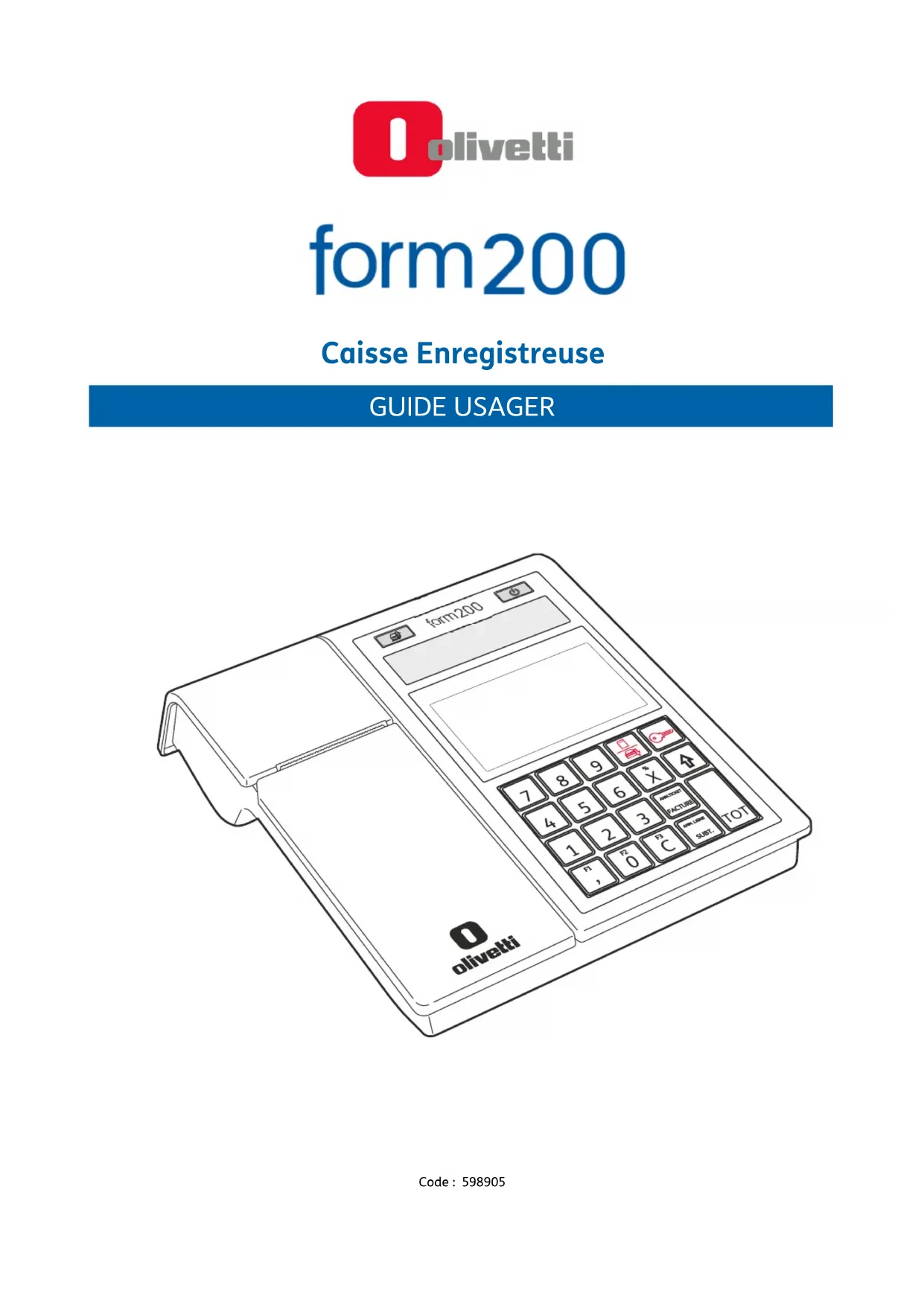 Ce guide rapide décrit la caisse enregistreuse form 200. Le manuel d’instruction pour l’usage de la caisse enregistreuse est disponible en version électronique sur le site Olivetti à l’adresse : www.olivetti.fr Il convient de noter que les actions suivantes peuvent compromettre la conformité attestée ci-dessus et évidemment les caractéristiques du produit : mauvaise alimentation électrique mauvaise installation ou usage erroné ou inapproprié ou bien non conforme aux avertissements énoncés sur le manuel du produit remplacement des composants ou accessoires d’origine par d’autres de type non approuvé par le constructeur, ou effectué par du personnel non autorisé. Pour la sécurité de l’utilisateur Brancher la machine à proximité d’une prise murale facilement accessible. N’intervenir sur l’imprimante que pour en remplacer des pièces. Ne pas utiliser la machine au-dessus ou près de sources de chaleur (ex. : radiateurs) ou d’eau (ex. : piscines ou douches). Pour éteindre complètement l’appareil, débrancher le cordon d’alimentation de la prise murale. Pour nettoyer la machine, la débrancher de la prise murale et utiliser un chiffon humide. NE PAS utiliser des produits corrosifs.1-1 Form200