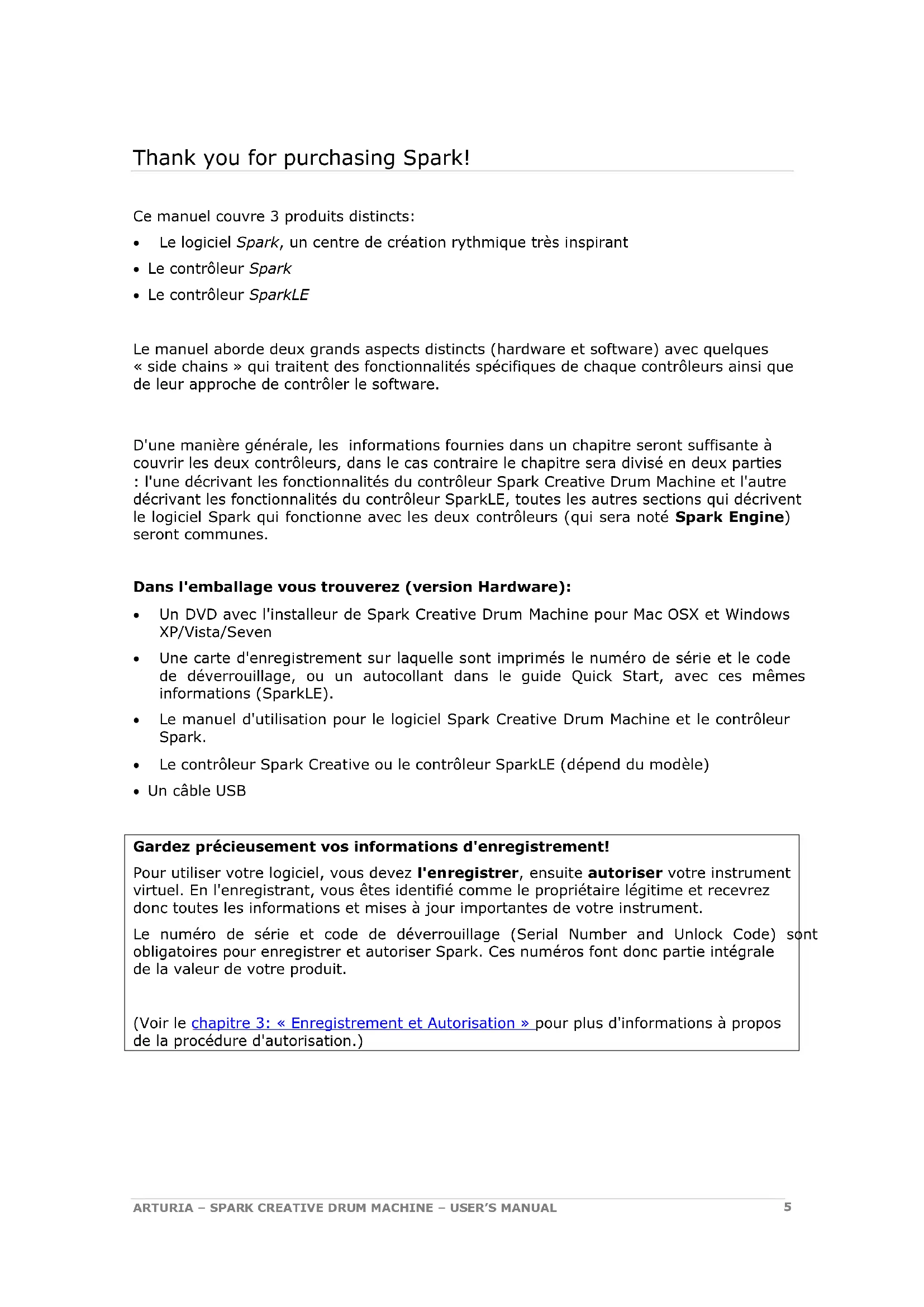 Thank you for purchasing Spark! Ce manuel couvre 3 produits distincts: Le logiciel Spark, un centre de création rythmique très inspirant Le contrôleur Spark Le contrôleur SparkLE Le manuel aborde deux grands aspects distincts (hardware et software) avec quelques « side chains » qui traitent des fonctionnalités spécifiques de chaque contrôleurs ainsi que de leur approche de contrôler le software. D'une manière générale, les informations fournies dans un chapitre seront suffisante à couvrir les deux contrôleurs, dans le cas contraire le chapitre sera divisé en deux parties : l'une décrivant les fonctionnalités du contrôleur Spark Creative Drum Machine et l'autre décrivant les fonctionnalités du contrôleur SparkLE, toutes les autres sections qui décrivent le logiciel Spark qui fonctionne avec les deux contrôleurs (qui sera noté Spark Engine) seront communes. Dans l'emballage vous trouverez (version Hardware): Un DVD avec l'installeur de Spark Creative Drum Machine pour Mac OSX et Windows XP/Vista/Seven Une carte d'enregistrement sur laquelle sont imprimés le numéro de série et le code de déverrouillage, ou un autocollant dans le guide Quick Start, avec ces mêmes informations (SparkLE). Le manuel d'utilisation pour le logiciel Spark Creative Drum Machine et le contrôleur Spark. Le contrôleur Spark Creative ou le contrôleur SparkLE (dépend du modèle) Un câble USB Gardez précieusement vos informations d'enregistrement! Pour utiliser votre logiciel, vous devez l'enregistrer, ensuite autoriser votre instrument virtuel. En l'enregistrant, vous êtes identifié comme le propriétaire légitime et recevrez donc toutes les informations et mises à jour importantes de votre instrument. Le numéro de série et code de déverrouillage (Serial Number and Unlock Code) sont obligatoires pour enregistrer et autoriser Spark. Ces numéros font donc partie intégrale de la valeur de votre produit. (Voir le chapitre 3: « Enregistrement et Autorisation » pour plus d'informations à propos de la procédure d'autorisation.)ARTURIA – SPARK CREATIVE DRUM MACHINE – USER’S MANUAL
