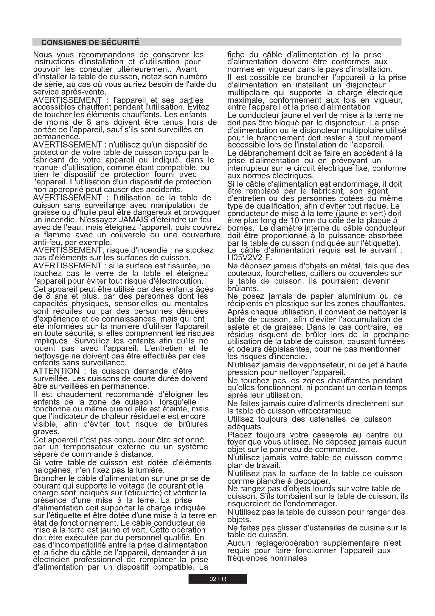 touchez pas le verre de la table et éteignez l'appareil pour éviter tout risque d'électrocution. Cet appareil peut être utilisé par des enfants âgés de 8 ans et plus, par des personnes dont les capacités physiques, sensorielles ou mentales sont réduites ou par des personnes dénuées d'expérience et de connaissances, mais qui ont été informées sur la manière d'utiliser l'appareil en toute sécurité, si elles comprennent les risques impliqués. Surveillez les enfants afin qu'ils ne jouent pas avec l'appareil. L'entretien et le nettoyage ne doivent pas être effectués par des enfants sans surveillance. ATTENTION : la cuisson demande d'être surveillée. Les cuissons de courte durée doivent être surveillées en permanence. Il est chaudement recommandé d'éloigner les enfants de la zone de cuisson lorsqu'elle fonctionne ou même quand elle est éteinte, mais que l'indicateur de chaleur résiduelle est encore visible, afin d'éviter tout risque de brûlures graves. Cet appareil n'est pas conçu pour être actionné par un temporisateur externe ou un système séparé de commande à distance. Si votre table de cuisson est dotée d'éléments halogènes, n'en fixez pas la lumière. Brancher le câble d'alimentation sur une prise de courant qui supporte le voltage (le courant et la charge sont indiqués sur l'étiquette) et vérifier la présence d'une mise à la terre. La prise d'alimentation doit supporter la charge indiquée sur l'étiquette et être dotée d'une mise à la terre en état de fonctionnement. Le câble conducteur de mise à la terre est jaune et vert. Cette opération doit être exécutée par du personnel qualifié. En cas d'incompatibilité entre la prise d'alimentation et la fiche du câble de l'appareil, demander à un électricien professionnel de remplacer la prise d'alimentation par un dispositif compatible. La