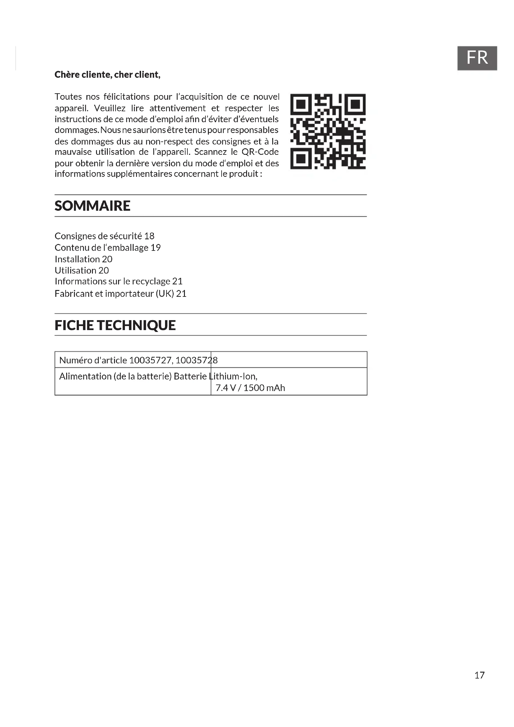 Chère cliente, cher client, Toutes nos félicitations pour l’acquisition de ce nouvel appareil. Veuillez lire attentivement et respecter les instructions de ce mode d’emploi an d’éviter d’éventuels dommages. Nous ne saurions être tenus pour responsables des dommages dus au non-respect des consignes et à la mauvaise utilisation de l’appareil. Scannez le QR-Code pour obtenir la dernière version du mode d‘emploi et des informations supplémentaires concernant le produit : SOMMAIRE Consignes de sécurité 18 Contenu de l‘emballage 19 Installation 20 Utilisation 20 Informations sur le recyclage 21 Fabricant et importateur (UK) 21 FICHE TECHNIQUE Numéro d'article 10035727, 10035728 Alimentation (de la batterie) Batterie Lithium-Ion,