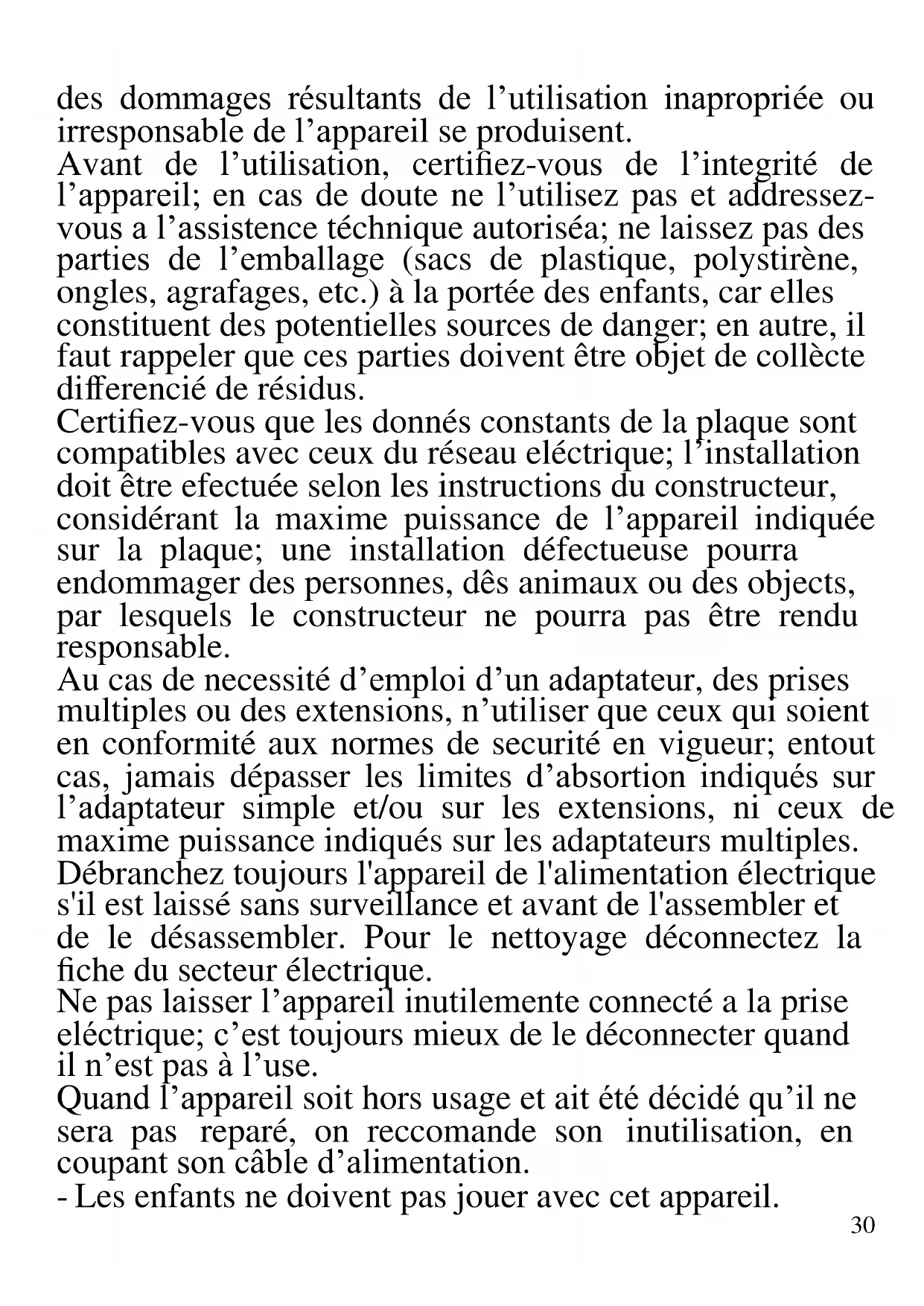 FRANCAIS: ADVERTISSEMENT Les indications suivantes sont très importantes en ce qui concerne l’installation, usage et manutention de cet appareil; gardez soigneusement ce manuel pour des futures consultations; n’utilisez pas l’appareil que selon les indications de ce manuel d’instructions; n’importe quel autre type d’ utilisation devra être consideré inaproprié et potentiellement dangereux; pour cette raison le constructeur ne pourra pas être rendu responsable si30 des dommages résultants de l’utilisation inapropriée ou irresponsable de l’appareil se produisent. Avant de l’utilisation, certifiez-vous de l’integrité de l’appareil; en cas de doute ne l’utilisez pas et addressez- vous a l’assistence téchnique autoriséa; ne laissez pas des parties de l’emballage (sacs de plastique, polystirène, ongles, agrafages, etc.) à la portée des enfants, car elles constituent des potentielles sources de danger; en autre, il faut rappeler que ces parties doivent être objet de collècte differencié de résidus. Certifiez-vous que les donnés constants de la plaque sont compatibles avec ceux du réseau eléctrique; l’installation doit être efectuée selon les instructions du constructeur, considérant la maxime puissance de l’appareil indiquée sur la plaque; une installation défectueuse pourra endommager des personnes, dês animaux ou des objects, par lesquels le constructeur ne pourra pas être rendu responsable. Au cas de necessité d’emploi d’un adaptateur, des prises multiples ou des extensions, n’utiliser que ceux qui soient en conformité aux normes de securité en vigueur; entout cas, jamais dépasser les limites d’absortion indiqués sur l’adaptateur simple et/ou sur les extensions, ni ceux de maxime puissance indiqués sur les adaptateurs multiples. Débranchez toujours l'appareil de l'alimentation électrique s'il est laissé sans surveillance et avant de l'assembler et de le désassembler. Pour le nettoyage déconnectez la fiche du secteur électrique. Ne pas laisser l’appareil inutilemente connecté a la prise eléctrique; c’est toujours mieux de le déconnecter quand il n’est pas à l’use. Quand l’appareil soit hors usage et ait été décidé qu’il ne sera pas reparé, on reccomande son inutilisation, en coupant son câble d’alimentation. - Les enfants ne doivent pas jouer avec cet appareil.31 - Ne pas utiliser l’appareil si le câble d’alimentation ou la fiche de connéction eléctrique sont endommagés, ou encore en cas de court-circuits; dans ce cas là, apporter l’appareil a un centre d’assistence autorisé. - Ne pas approcher le câble d’alimentation d’objects coupants ou de surfaces chaudes, et ne pas tirer sur le cordon d’alimentation pour le débrancher de la prise. Ne le laissez pas pendre du plan de travail où un enfant pourrait le tenir. - L’appareil n’est pas indiqué pour être exposé à des conditions météorologiques défavorables (pluie, vent, humidité, la glace, etc.); Gardez-le dans un endroit sec. Jamais opérer ou même toucher l’appareil avec les mains mouillées ou les pieds nus. - Ce produit ne doit pas être utilisé par les enfants, même s'ils ont plus de 8 ans. - Cet appareil peut être utilisé par des personnes ayant des capacités physiques, sensorielles ou mentales réduites, ou qui manquent d'expérience ou de connaissances, si elles ont été correctement supervisées ou ont reçu des instructions pour utiliser cet appareil en toute sécurité. - Gardez l’appareil et le câble d’alimentation hors la portée des enfants agés de moins de 8 ans. Le derrière de l’appareil doit être tourné contre un mur. Au cas de panne et/ou de mauvais fonctionnement, ne pas intervenir sur l’ appareil. Pour une éventuel réparation s’addresser uniquement a un centre autorisé par le constructeur, en demandant dês pièces de remplacement originaux. Le non respect de ces indications peut compromettre la securité de l’appareil e rendre invalides les termes de la garantie. - L’appareil est pour l’usage domestique et intérieur. - Cet appareil est destiné à être utilisé dans les ménages et des applications similaires: les cuisines du personnel dans les magasins, bureaux et autres environnements32 de travail, pour les clients dans les hôtels, motels et autres environnements de type résidentiel, de type lit et petit-déjeuner, hébergement. - L’appareil n’est pas conçu pour être utilisé avec une minuterie extérieure ou un commande à distance. - N’utiliser que des accéssoires e pièces d’origine. - Avant chaque utilisation, effectuez le cordon d'alimentation. Ne soumettez pas le produit à des chocs susceptibles de l'endommager. - Tenir l’appareil à l’écart des environnements où il peut y avoir des gaz, vapeurs, des substances inflammables ou explosives.