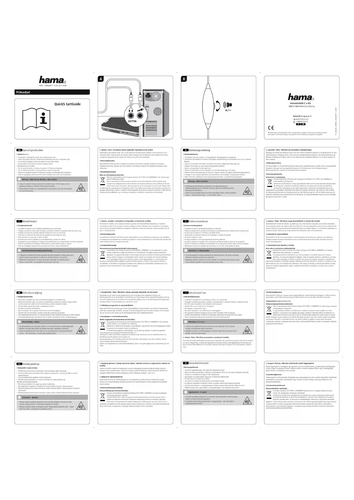 En fonction du modèle,une ou plusieurs fonctionsavancées sont éventuellement disponiblessur l‘unité de commandeducâble du micro-casque. Fonctions: réglageduvolume(Volume),miseensourdine du microphone danslebrasdumicrophone(Mute) ou microphone installé dans l‘unitédecommande. Veuillez consulterlag. B pourlefonctionnement.3. Exclusion de garantie La société HamaGmbH&Co KG décline toute responsabilité en casdedommages provoqués parune installation, un montage ou uneutilisationnon conformes du produit ou encoreprovoqués par un nonrespectdes consignesdu moded‘emploi et/oudes consignesdesécurité.