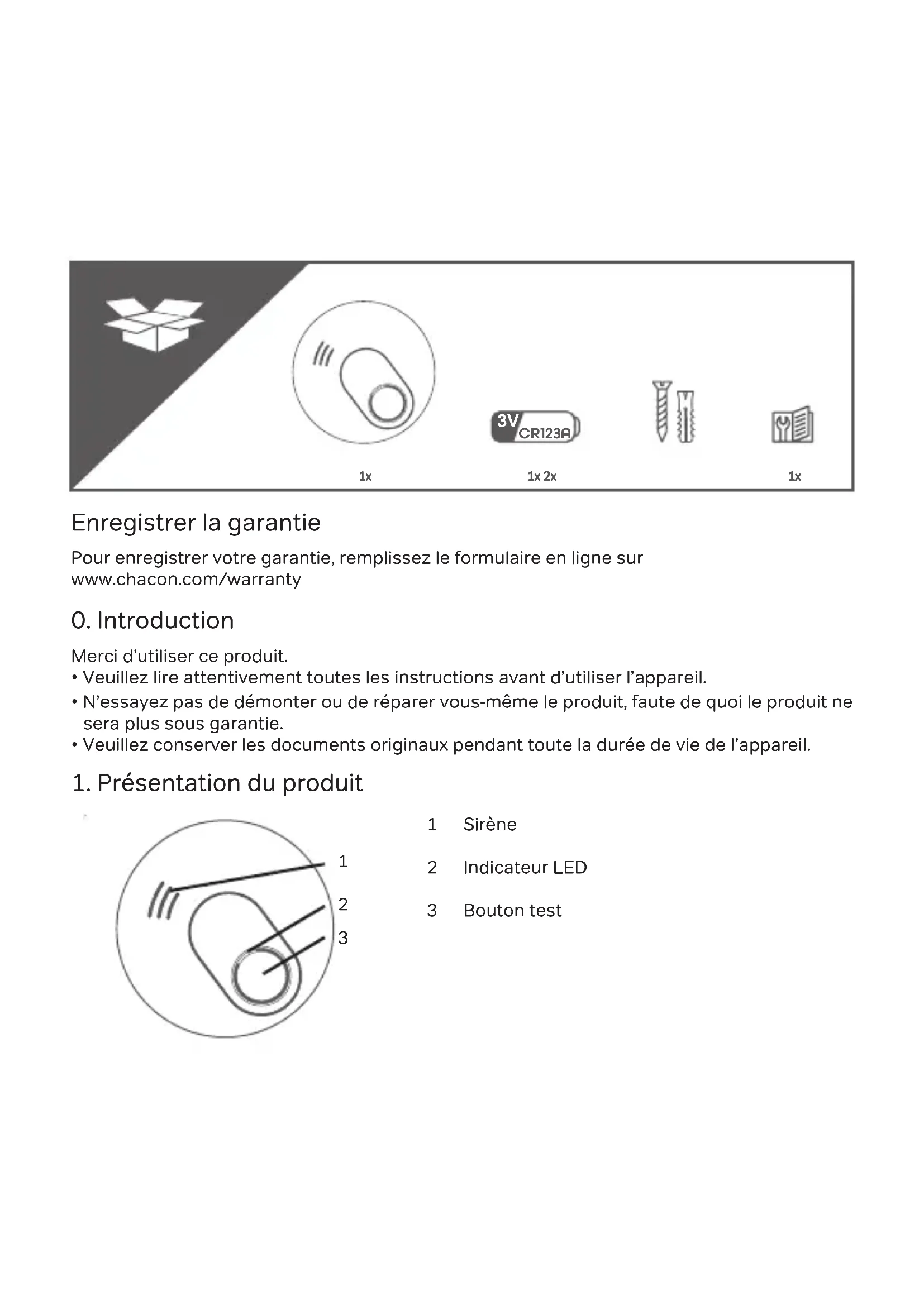 Pour enregistrer votre garantie, remplissez le formulaire en ligne sur www.chacon.com/warrantyMerci d’utiliser ce produit.• Veuillez lire attentivement toutes les instructions avant d’utiliser l’appareil.• N’essayez pas de démonter ou de réparer vous-même le produit, faute de quoi le produit ne sera plus sous garantie.• Veuillez conserver les documents originaux pendant toute la durée de vie de l’appareil.