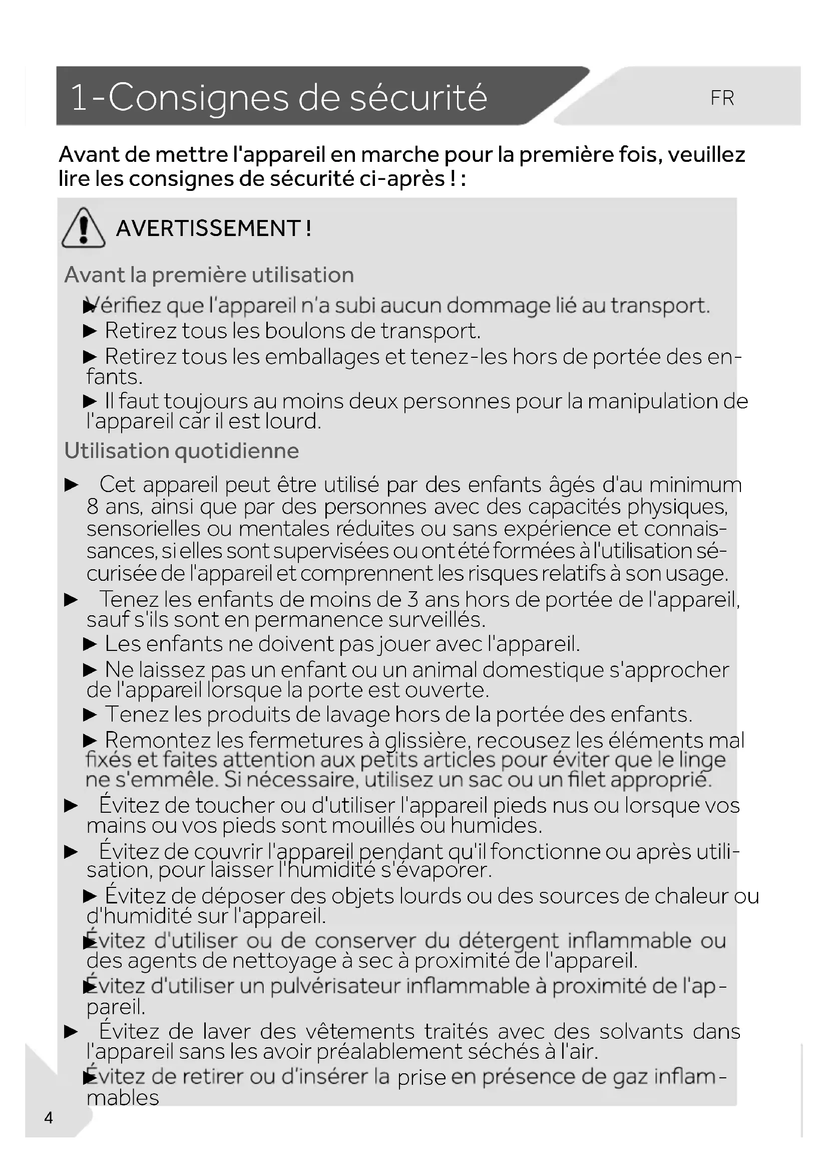 ▶ Retirez tous les boulons de transport. ▶ Retirez tous les emballages et tenez-les hors de portée des en- fants. ▶ Il faut toujours au moins deux personnes pour la manipulation de l'appareil car il est lourd. Utilisation quotidienne ▶ Cet appareil peut être utilisé par des enfants âgés d'au minimum 8ans, ainsi que par des personnes avec des capacités physiques, sensorielles ou mentales réduites ou sans expérience et connais- sances, si elles sont supervisées ou ont été formées à l'utilisation sé- curisée de l'appareil et comprennent les risques relatifs à son usage. ▶ Tenez les enfants de moins de 3ans hors de portée de l'appareil, sauf s'ils sont en permanence surveillés. ▶ Les enfants ne doivent pas jouer avec l'appareil. ▶ Ne laissez pas un enfant ou un animal domestique s'approcher de l'appar eil lorsque la porte est ouverte. ▶ Tenez les produits de lavage hors de la portée des enfants. ▶ Remontez les fermetures à glissière, recousez les éléments mal ▶ Évitez de toucher ou d'utiliser l'appareil pieds nus ou lorsque vos mains ou vos pieds sont mouillés ou humides. ▶ Évitez de couvrir l'appareil pendant qu'il fonctionne ou après utili- sation, pour laisser l'humidité s'évaporer. ▶ Évitez de déposer des objets lourds ou des sources de chaleur ou d'humidité sur l'appareil.