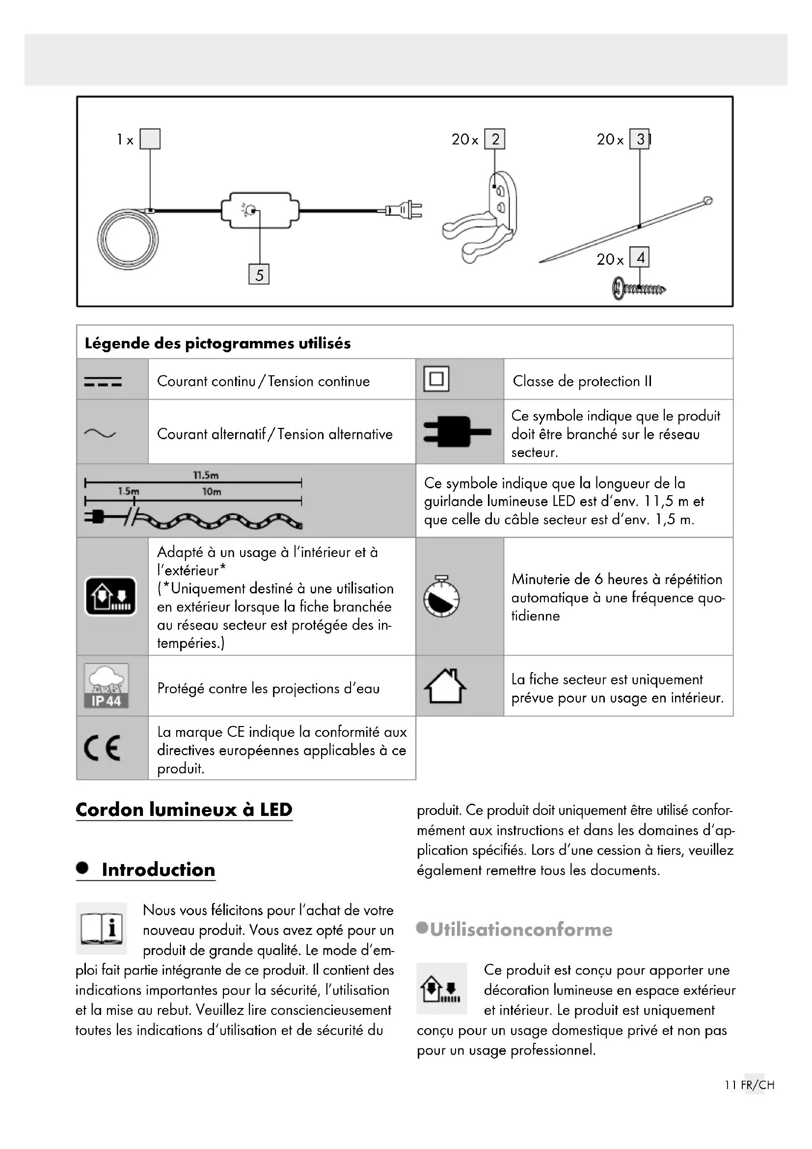 20 x 512 FR/CH La fiche secteur est uniquement prévue pour un usage en intérieur. Contenu de la livraison 1 x guirlande à LED de 10 m 20 x agrafes de fixation 20 x attache-câbles 20 x vis 1 x mode d‘emploi Descriptif des pièces