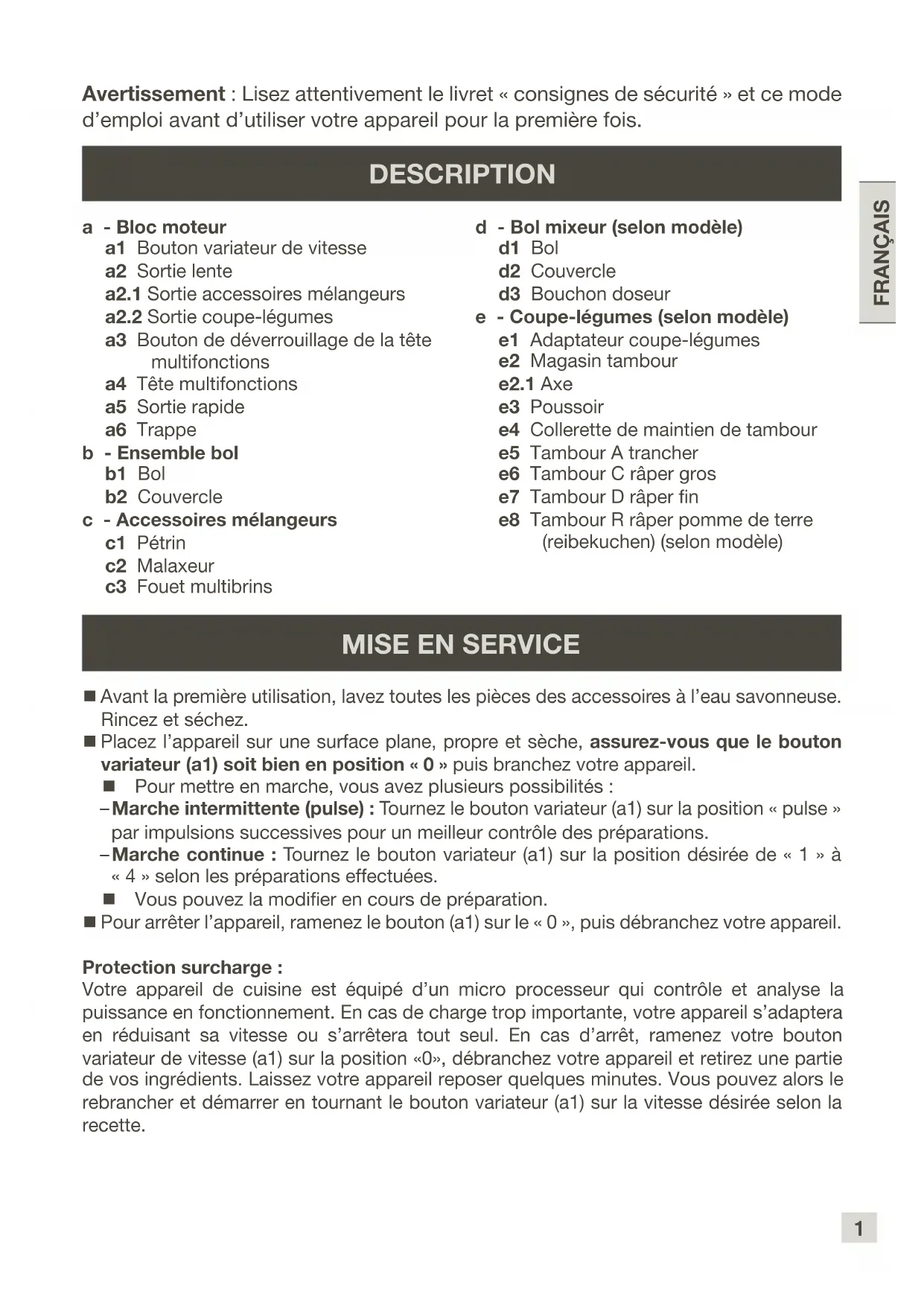 a - Bloc moteur a1 Bouton variateur de vitesse a2 Sortie lente a2.1 Sortie accessoires mélangeurs a2.2 Sortie coupe-légumes a3 Bouton de déverrouillage de la tête multifonctions a4 Tête multifonctions a5 Sortie rapide a6 Trappe b - Ensemble bol b1 Bol b2 Couvercle c - Accessoires mélangeurs c1 Pétrin c2 Malaxeur c3 Fouet multibrins d - Bol mixeur (selon modèle) d1 Bol d2 Couvercle d3 Bouchon doseur e - Coupe-légumes (selon modèle) e1 Adaptateur coupe-légumes e2 Magasin tambour e2.1 Axe e3 Poussoir e4 Collerette de maintien de tambour e5 Tambour A trancher e6 Tambour C râper gros e7 Tambour D râper n e8 Tambour R râper pomme de terre (reibekuchen) (selon modèle) Avant la première utilisation, lavez toutes les pièces des accessoires à l’eau savonneuse. Rincez et séchez. Placez l’appareil sur une surface plane, propre et sèche, assurez-vous que le bouton variateur (a1) soit bien en position « 0 » puis branchez votre appareil. Pour mettre en marche, vous avez plusieurs possibilités : –Marche intermittente (pulse) : Tournez le bouton variateur (a1) sur la position « pulse » par impulsions successives pour un meilleur contrôle des préparations. –Marche continue : Tournez le bouton variateur (a1) sur la position désirée de « 1 » à « 4 » selon les préparations effectuées. Vous pouvez la modier en cours de préparation. Pour arrêter l’appareil, ramenez le bouton (a1) sur le « 0 », puis débranchez votre appareil. Protection surcharge : Votre appareil de cuisine est équipé d’un micro processeur qui contrôle et analyse la puissance en fonctionnement. En cas de charge trop importante, votre appareil s’adaptera en réduisant sa vitesse ou s’arrêtera tout seul. En cas d’arrêt, ramenez votre bouton variateur de vitesse (a1) sur la position «0», débranchez votre appareil et retirez une partie de vos ingrédients. Laissez votre appareil reposer quelques minutes. Vous pouvez alors le rebrancher et démarrer en tournant le bouton variateur (a1) sur la vitesse désirée selon la recette.