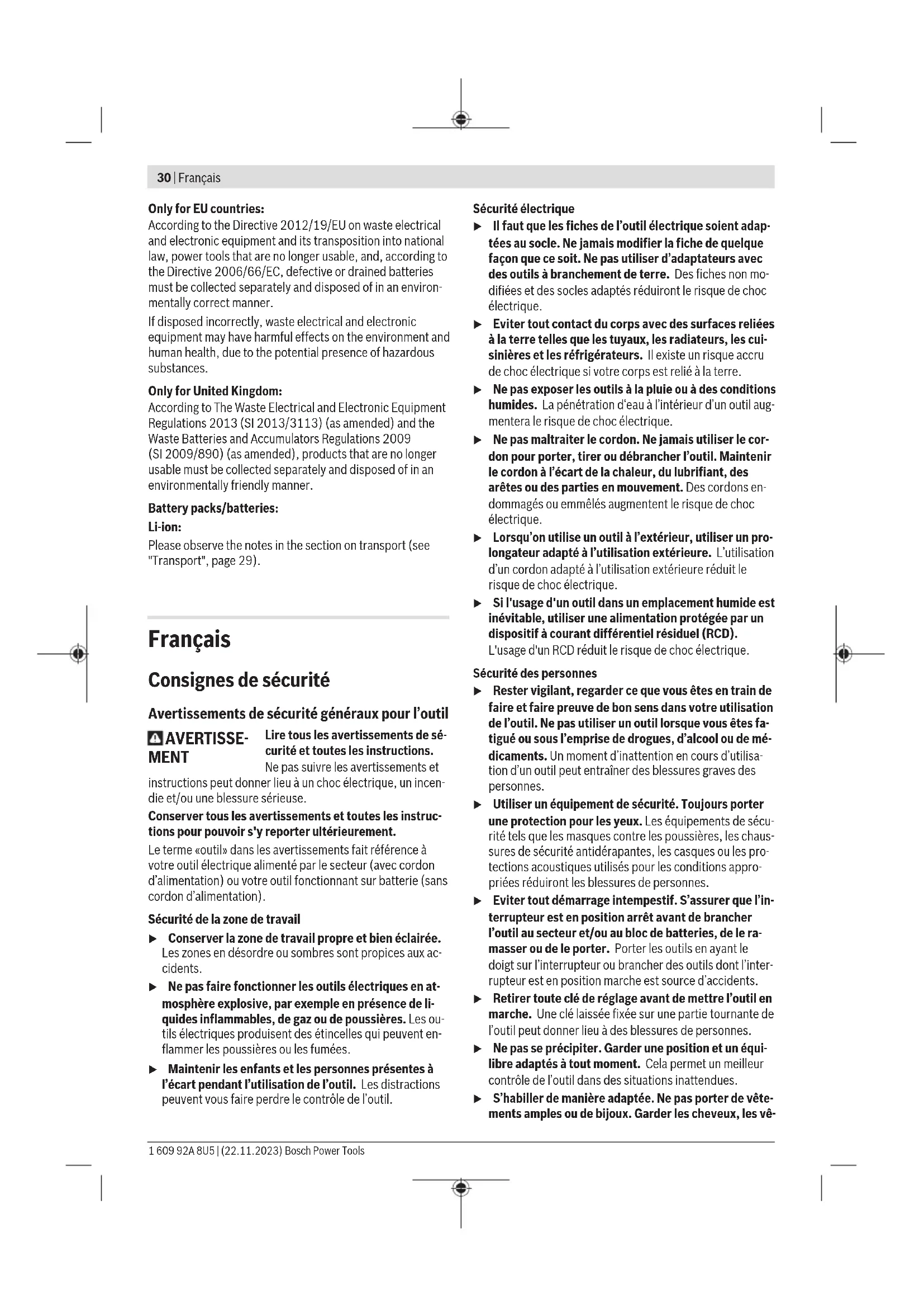 1,5 1,5 1,5 Le niveau de vibration et la valeur d’émission sonore indi- qués dans cette notice d’utilisation ont été mesurés selon une procédure de mesure normalisée et peuvent être utilisés pour établir une comparaison entre différents outils électro- portatifs. Ils peuvent aussi servir de base à une estimation préliminaire du taux de vibration et du niveau sonore. Le niveau de vibration et la valeur d’émission sonore indi- qués s’appliquent pour les utilisations principales de l’outil électroportatif. Si l’outil électroportatif est utilisé pour d’autres applications, avec d’autres accessoires de travail ou sans avoir fait l’objet d’un entretien régulier, le niveau de vi- bration et la valeur d’émission sonore peuvent différer. Il peut en résulter des vibrations et un niveau sonore nette- ment plus élevés pendant toute la durée de travail. Pour une estimation précise du niveau de vibration et du ni- veau sonore, il faut aussi prendre en considération les pé- riodes pendant lesquelles l’outil est éteint ou bien en marche sans être vraiment en action. Il peut en résulter au final un ni- veau de vibration et un niveau sonore nettement plus faibles pendant toute la durée de travail. Prévoyez des mesures de protection supplémentaires per- mettant de protéger l’utilisateur de l’effet des vibrations, par exemple : maintenance de l’outil électroportatif et des acces- soires de travail, maintien des mains au chaud, organisation des procédures de travail. Accu u Retirez l’accu de l’appareil électroportatif avant toute intervention (opérations d’entretien/de maintenance, changement d’accessoire, etc.) ainsi que lors de son transport et rangement. Il y a sinon risque de blessure lorsqu’on appuie par mégarde sur l’interrupteur Marche/ Arrêt. Bosch vend ses outils électroportatifs sans-fil aussi sans ac- cu. Il est indiqué sur l’emballage si un accu est fourni ou non avec l’outil électroportatif. Recharge de l’accu u N’utilisez que les chargeurs indiqués dans les Caracté- ristiques techniques. Seuls ces chargeurs sont adaptés à l’accu Lithium-Ion de votre outil électroportatif. Remarque: Les dispositions internationales en vigueur pour le transport de marchandises obligent à livrer les accus Li- thium-Ion partiellement chargés. Pour que les accus soient pleinement performants, chargez-les complètement avant leur première utilisation. Mise en place de l’accu Insérez l’accu dans le compartiment à accu jusqu’à ce qu’il s’enclenche. Retrait de l’accu Pour retirer l’accu, appuyez sur le bouton de déverrouillage de l’accu et sortez l’accu de l’outil électroportatif. Ne forcez pas. L’accu dispose d’un double verrouillage permettant d’éviter qu’il tombe si vous appuyez par mégarde sur le bouton de déverrouillage d’accu. Tant que l’accu est en place dans l’ou- til électroportatif, un ressort le maintient en position. Indicateur de niveau de charge de l’accu Remarque : Tous les types d’accu ne possèdent pas d’indica- teur d’état de charge. Les LED vertes de l'indicateur d'état de charge indiquent le niveau de charge de la batterie. Pour des raisons de sécuri- té, il n’est possible d’afficher l’état de charge que quand l’ou- til électroportatif est à l’arrêt. Pour afficher le niveau de charge, appuyez sur le bouton de l'indicateur de niveau de charge ou . L’affichage du ni- veau de charge est également possible après retrait de l’ac- cu. Si aucune LED ne s'allume après avoir appuyé sur le bouton de l'indicateur de niveau de charge, la batterie est défec- tueuse et doit être remplacée. Le niveau de charge de l’accu est également affiché sur l’écran de contrôle (voir «Affichages d’état», Page36). Batterie de type GBA 18V... LED Capacité Allumage permanent en vert de 3LED 60–100% Allumage permanent en vert de 2LED 30–60% Allumage permanent en vert de 1LED 5–30% Clignotement en vert de 1LED 0–5% 1 609 92A 8U5 | (22.11.2023) Bosch Power ToolsFrançais | 35 Batterie de type ProCORE18V... LED Capacité Allumage permanent en vert de 5LED 80–100% Allumage permanent en vert de 4LED 60–80% Allumage permanent en vert de 3LED 40–60% Allumage permanent en vert de 2LED 20–40% Allumage permanent en vert de 1LED 5–20% Clignotement en vert de 1LED 0–5% Indications pour une utilisation optimale de la batterie Protégez l’accu de l’humidité et de l’eau. Ne stockez l’accu que dans la plage de températures de –20 à 50 °C. Ne laissez par ex. pas l’accu dans une voiture en plein été. Nettoyez de temps en temps les orifices de ventilation de l’accu à l’aide d’un pinceau doux, propre et sec. Une baisse notable de l’autonomie de l’accu au fil des re- charges effectuées indique que l’accu est arrivé en fin de vie et qu’il doit être remplacé. Respectez les indications concernant l’élimination. Montage u Retirez l’accu de l’appareil électroportatif avant toute intervention (opérations d’entretien/de maintenance, changement d’accessoire, etc.) ainsi que lors de son transport et rangement. Il y a sinon risque de blessure lorsqu’on appuie par mégarde sur l’interrupteur Marche/ Arrêt. Chargement du magasin (voir figures A1−A4) u Retirez l’accu avant tout réglage, changement d’ac- cessoire ou avant de ranger l’outil électroportatif. De telles mesures de sécurité préventives réduisent le risque de démarrage accidentel de l’outil. N’utilisez que des accessoiresBosch d’origine. Les pièces de précision de l’outil électroportatif telles que le magasin, le nez d’éjection et le canal d'éjection conviennent aux agrafes, clous et broches de Bosch. Les autres fabricants utilisent des qualités d’acier et des dimensions d’agrafes différentes. Remarque: N’utilisez que les clous indiqués dans le tableau «Caractéristiques techniques». L’utilisat