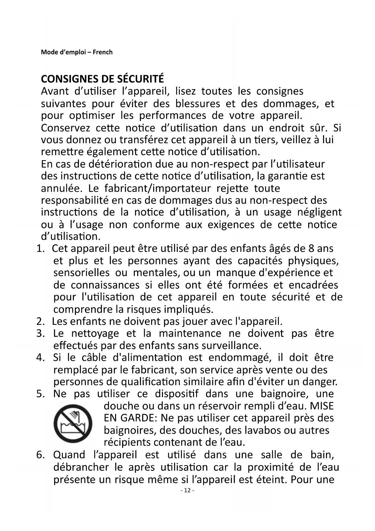 Avant d’utiliser l’appareil, lisez toutes les consignes suivantes pour éviter des blessures et des dommages, et pour optimiser les performances de votre appareil. Conservez cette notice d’utilisation dans un endroit sûr. Si vous donnez ou transférez cet appareil à un tiers, veillez à lui remettre également cette notice d’utilisation. En cas de détérioration due au non-respect par l’utilisateur des instructions de cette notice d’utilisation, la garantie est annulée. Le fabricant/importateur rejette toute responsabilité en cas de dommages dus au non-respect des instructions de la notice d’utilisation, à un usage négligent ou à l’usage non conforme aux exigences de cette notice d’utilisation.