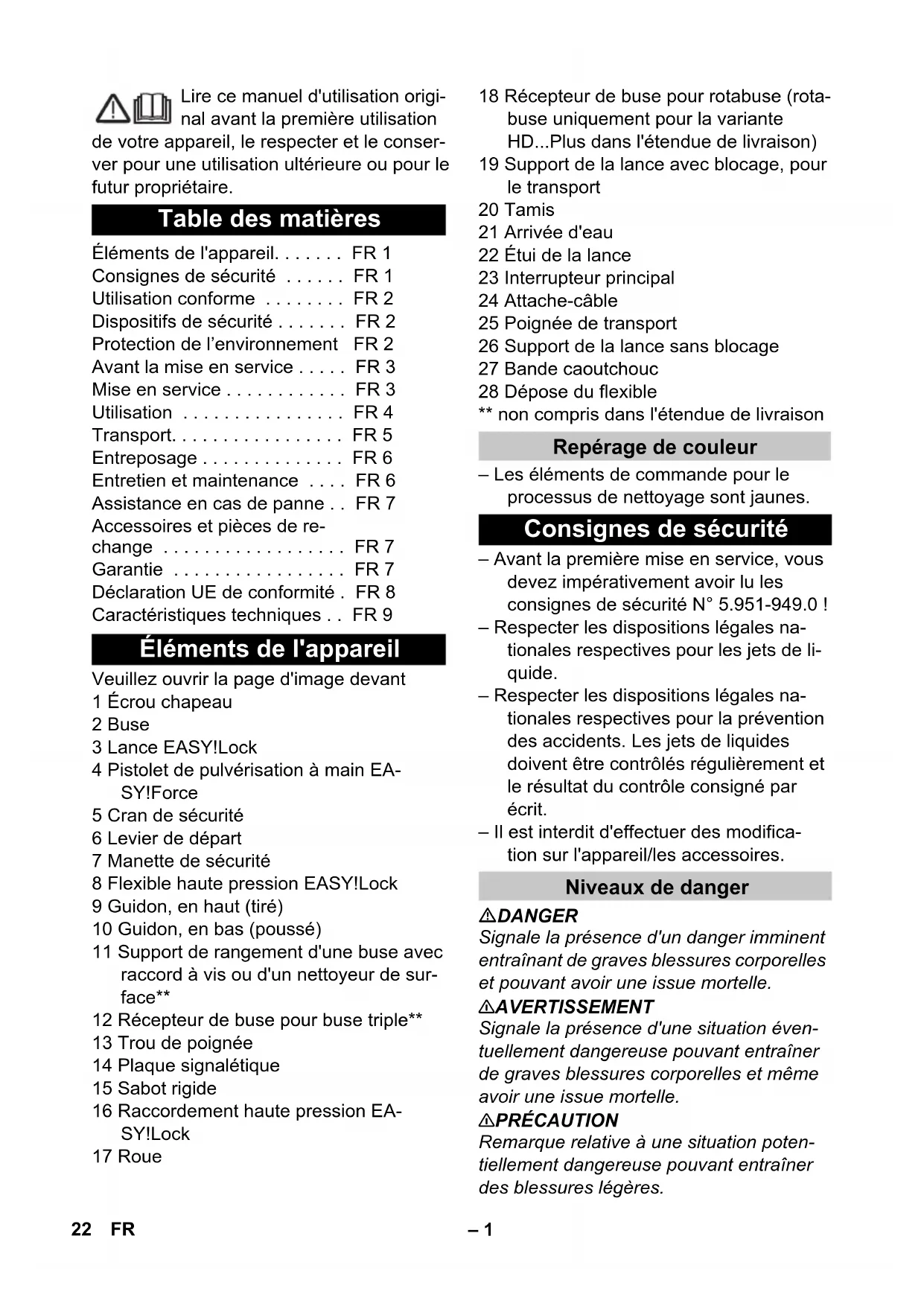 - dB(A) 89 Dimensions and weights Length mm 351 Width mm 312 Height mm 904 Typical operating weight kg 20,5 21EN– 1 Lire ce manuel d'utilisation origi- nal avant la première utilisation de votre appareil, le respecter et le conser- ver pour une utilisation ultérieure ou pour le futur propriétaire. Veuillez ouvrir la page d'image devant 1 Écrou chapeau 2 Buse 3 Lance EASY!Lock 4 Pistolet de pulvérisation à main EA- SY!Force 5 Cran de sécurité 6 Levier de départ 7 Manette de sécurité 8 Flexible haute pression EASY!Lock 9 Guidon, en haut (tiré) 10 Guidon, en bas (poussé) 11 Support de rangement d'une buse avec raccord à vis ou d'un nettoyeur de sur- face** 12 Récepteur de buse pour buse triple** 13 Trou de poignée 14 Plaque signalétique 15 Sabot rigide 16 Raccordement haute pression EA- SY!Lock 17 Roue 18 Récepteur de buse pour rotabuse (rota- buse uniquement pour la variante HD Plus dans l'étendue de livraison) 19 Support de la lance avec blocage, pour le transport 20 Tamis 21 Arrivée d'eau 22 Étui de la lance 23 Interrupteur principal 24 Attache-câble 25 Poignée de transport 26 Support de la lance sans blocage 27 Bande caoutchouc 28 Dépose du flexible ** non compris dans l'étendue de livraison – Les éléments de commande pour le processus de nettoyage sont jaunes. – Avant la première mise en service, vous devez impérativement avoir lu les consignes de sécurité N° 5.951-949.0 ! – Respecter les dispositions légales na- tionales respectives pour les jets de li- quide. – Respecter les dispositions légales na- tionales respectives pour la prévention des accidents. Les jets de liquides doivent être contrôlés régulièrement et le résultat du contrôle consigné par écrit. – Il est interdit d'effectuer des modifica- tion sur l'appareil/les accessoires. DANGER Signale la présence d'un danger imminent entraînant de graves blessures corporelles et pouvant avoir une issue mortelle. 몇 AVERTISSEMENT Signale la présence d'une situation éven- tuellement dangereuse pouvant entraîner de graves blessures corporelles et même avoir une issue mortelle. 몇 PRÉCAUTION Remarque relative à une situation poten- tiellement dangereuse pouvant entraîner des blessures légères. Table des matières Éléments de l'appareil FR 1 Consignes de sécurité FR 1 Utilisation conforme FR 2 Dispositifs de sécurité FR 2 Protection de l’environnement FR 2 Avant la mise en service FR 3 Mise en service FR 3 Utilisation FR 4 Transport FR 5 Entreposage FR 6 Entretien et maintenance FR 6 Assistance en cas de panne FR 7 Accessoires et pièces de re- change FR 7 Garantie FR 7 Déclaration UE de conformité . FR 8 Caractéristiques techniques FR 9 Éléments de l'appareil Repérage de couleur Consignes de sécurité Niveaux de danger 22 FR– 2 ATTENTION Remarque relative à une situation éven- tuellement dangereuse pouvant entraîner des dommages matériels. Une utilisation incorrecte des jets haute pression peut présenter des dangers. Le jet ne doit pas être dirigé sur des personnes, des ani- maux, des installations électriques actives ni sur l'appareil lui-même. Selon les directives en vigueur, l'ap- pareil ne doit jamais être exploité sans séparateur de système sur le réseau d'eau potable. Utiliser un sé- parateur de système approprié de la société KÄRCHER ou en alternative un séparateur système selon EN 12729 type BA. L'eau qui s'est écoulée à travers un sépara- teur système est classifiée comme non po- table. Utiliser exclusivement ce nettoyeur haute pression – pour un nettoyage avec le jet haute pression (par ex. nettoyage de façades, de terrasses, d'appareils de jardinage). Avec l'accessoire en option, du détergent peut être mélangé. Pour des salissures tenaces, nous recom- mandons une rotabuse (uniquement pour la variante HD