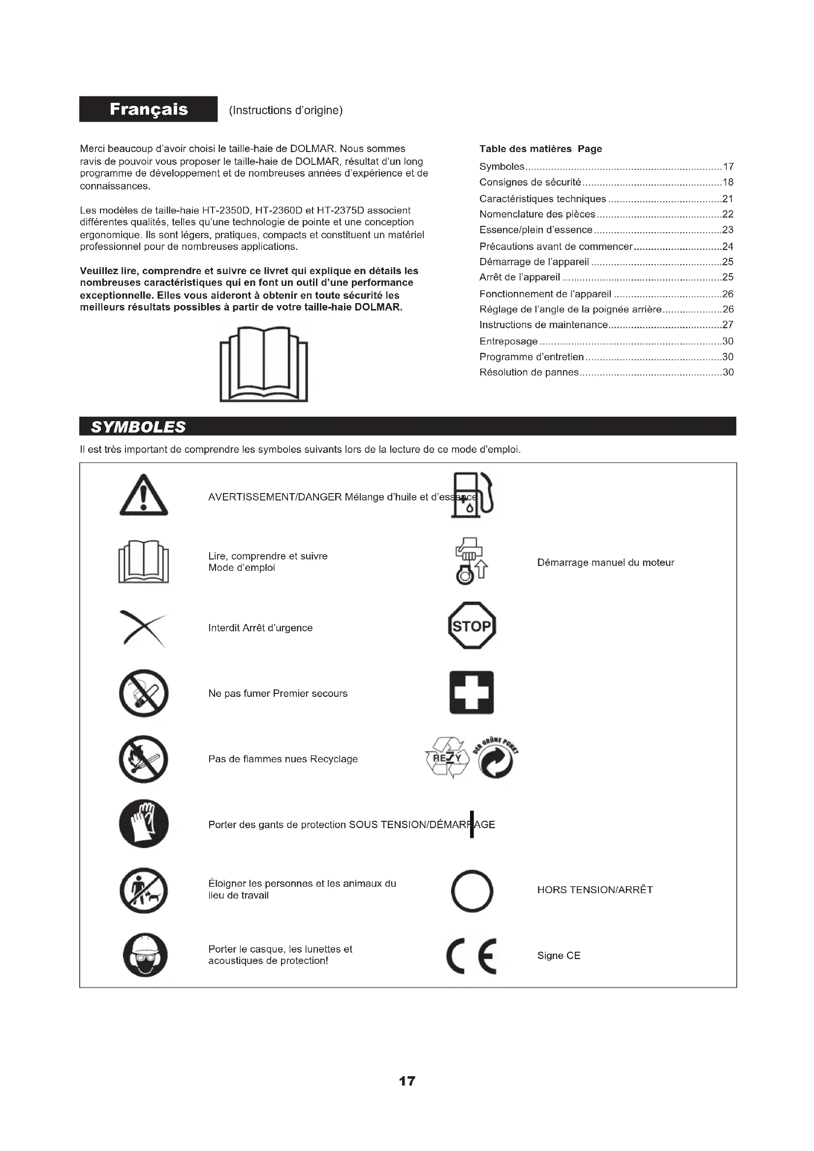 - Porter le casque, les lunettes et acoustiques de protection! Signe CE (Instructions d’origine) Table des matières Page Symboles p. 17