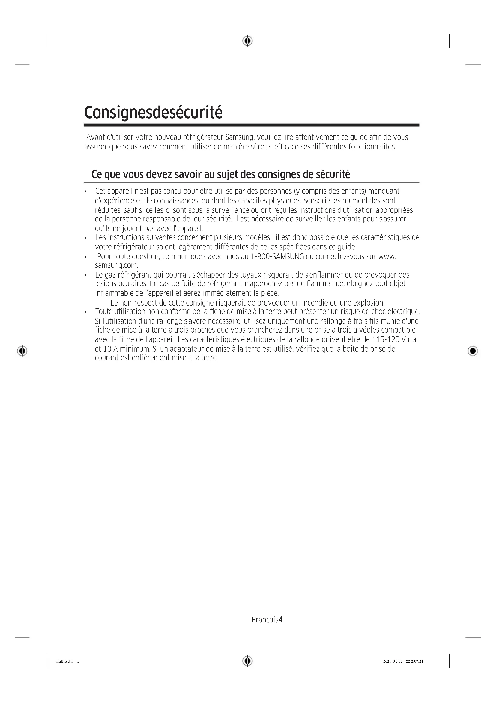 - Requires reader to be installed on your smartphone U.S.A 1-800-SAMSUNG (726-7864) 1-844-SAM-PAYS (726-7297) www.samsung.com/us/support CANADA 1-800-SAMSUNG (726-7864) 1-844-SAM-PAYS (726-7297) www.samsung.com/ca/support (English) www.samsung.com/ca_fr/support (French) Untitled-4 84Untitled-4 84 2025-04-02 2:05:012025-04-02 2:05:01Réfrigérateur Guide d'utilisation Appareil amovible Untitled-5 1Untitled-5 1 2025-04-02 2:07:212025-04-02 2:07:21Français2 Sommaire Consignes de sécurité 4 Ce que vous devez savoir au sujet des consignes de sécurité 4 Consignes de sécurité importantes et symboles : 5 Avertissement de la proposition 65 de l'État de Californie 5 Consignes de sécurité importantes 5 Symboles d'avertissement importants concernant le transport et le lieu d'installation de l'appareil 7 Avertissements importants concernant l'installation 8 Installation en toute sécurité 9 Avertissements importants concernant l'utilisation 10 Utilisation en toute sécurité 12 Nettoyage en toute sécurité 13 Avertissements importants concernant la mise au rebut 14 Installation 15 Présentation rapide du réfrigérateur 16 Installation étape par étape 20 Opérations 37 Panneau principal 37 SmartThings 44 Fonction SMART GRID (Réponse à la demande) (modèles applicables uniquement) 47 Fonctions spéciales 50 Maintenance 58 Utilisation et entretien 58 Nettoyage 66 Remplacement 68 Dépannage 71 Généralités 71 Votre réfrigérateur émet-il un bruit anormal ? 75 SmartThings 78 Smart Grid (modèles applicables uniquement) 79 Informations relatives à la garantie (CANADA) 80 Si votre réfrigérateur doit être réparé 80 Garantie limitée à l'acheteur initial 80 Obligation du propriétaire initial 80 Exclusions de la garantie 81 Untitled-5 2Untitled-5 2 2025-04-02 2:07:212025-04-02 2:07:21Français 3 Avis d'application de la réglementation 82 Avis de la FCC 82 Avis d'IC 83 Open Source Announcement 84 Untitled-5 3Untitled-5 3 2025-04-02 2:07:212025-04-02 2:07:21Français4 Consignes de sécurité Avant d'utiliser votre nouveau réfrigérateur Samsung, veuillez lire attentivement ce guide an de vous assurer que vous savez comment utiliser de manière sûre et efcace ses différentes fonctionnalités. Ce que vous devez savoir au sujet des consignes de sécurité