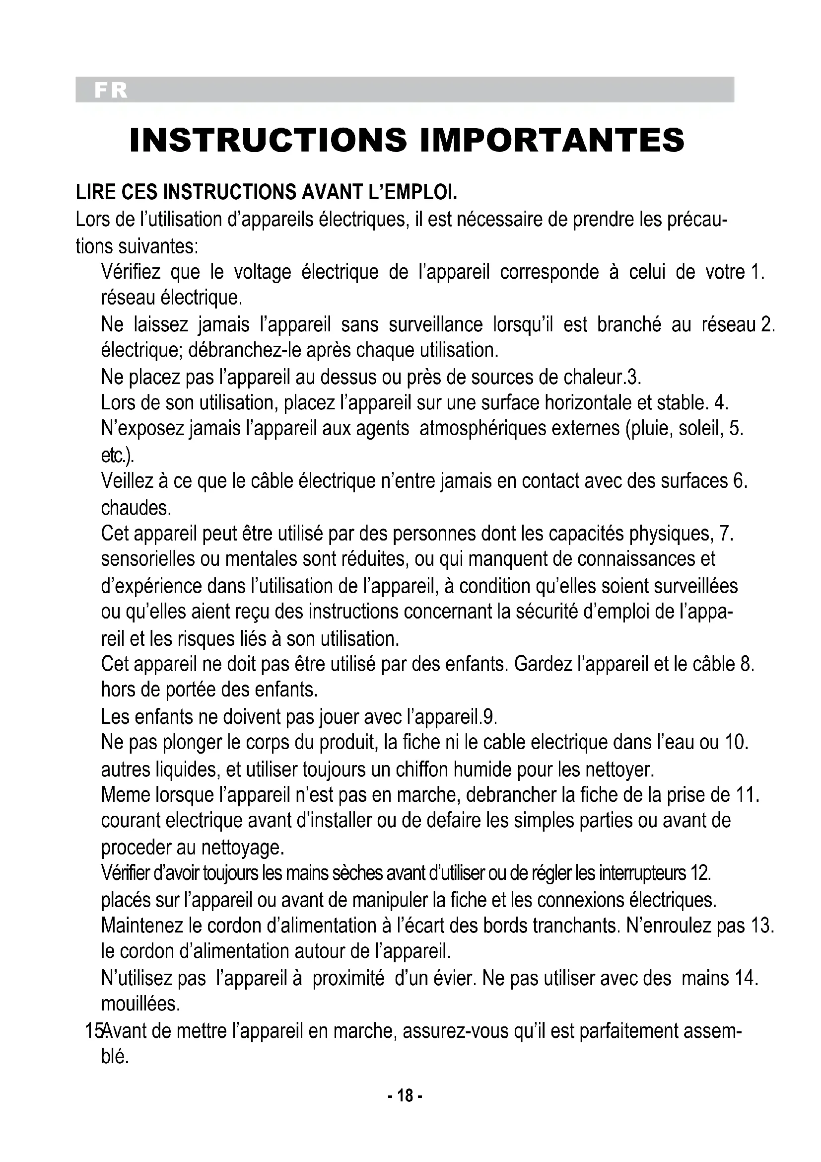 INSTRUCTIONS IMPORTANTES LIRE CES INSTRUCTIONS AVANT L’EMPLOI. Lors de l’utilisation d’appareils électriques, il est nécessaire de prendre les précau- tions suivantes: Vérifiez que le voltage électrique de l’appareil corresponde à celui de votre 1. réseau électrique. Ne laissez jamais l’appareil sans surveillance lorsqu’il est branché au réseau 2. électrique; débranchez-le après chaque utilisation. Ne placez pas l’appareil au dessus ou près de sources de chaleur.3. Lors de son utilisation, placez l’appareil sur une surface horizontale et stable. 4. N’exposez jamais l’appareil aux agents atmosphériques externes (pluie, soleil, 5. etc.). Veillez à ce que le câble électrique n’entre jamais en contact avec des surfaces 6. chaudes. Cet appareil peut être utilisé par des personnes dont les capacités physiques, 7. sensorielles ou mentales sont réduites, ou qui manquent de connaissances et d’expérience dans l’utilisation de l’appareil, à condition qu’elles soient surveillées ou qu’elles aient reçu des instructions concernant la sécurité d’emploi de l’appa- reil et les risques liés à son utilisation. Cet appareil ne doit pas être utilisé par des enfants. Gardez l’appareil et le câble 8. hors de portée des enfants. Les enfants ne doivent pas jouer avec l’appareil.9. Ne pas plonger le corps du produit, la fiche ni le cable electrique dans l’eau ou 10. autres liquides, et utiliser toujours un chiffon humide pour les nettoyer. Meme lorsque l’appareil n’est pas en marche, debrancher la fiche de la prise de 11. courant electrique avant d’installer ou de defaire les simples parties ou avant de proceder au nettoyage. Vérifier d’avoir toujours les mains sèches avant d’utiliser ou de régler les interrupteurs 12. placés sur l’appareil ou avant de manipuler la fiche et les connexions électriques. Maintenez le cordon d’alimentation à l’écart des bords tranchants. N’enroulez pas 13. le cordon d’alimentation autour de l’appareil. N’utilisez pas l’appareil à proximité d’un évier. Ne pas utiliser avec des mains 14. mouillées. Avant de mettre l’appareil en marche, assurez-vous qu’il est parfaitement assem-15. blé.FR