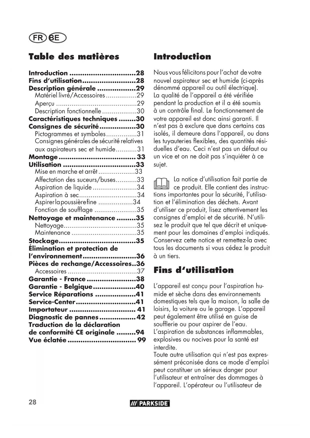 - Vue éclatée Introduction Nous vous félicitons pour l’achat de votre nouvel aspirateur sec et humide (ci-après dénommé appareil ou outil électrique). La qualité de l’appareil a été vériée pendant la production et il a été soumis à un contrôle nal. Le fonctionnement de votre appareil est donc ainsi garanti. Il n’est pas à exclure que dans certains cas isolés, il demeure dans l’appareil, ou dans les tuyauteries exibles, des quantités rési- duelles d’eau. Ceci n’est pas un défaut ou un vice et on ne doit pas s’inquiéter à ce sujet. La notice d’utilisation fait partie de ce produit. Elle contient des instruc- tions importantes pour la sécurité, l’utilisa- tion et l’élimination des déchets. Avant d’utiliser ce produit, lisez attentivement les consignes d’emploi et de sécurité. N’utili- sez le produit que tel que décrit et unique- ment pour les domaines d’emploi indiqués. Conservez cette notice et remettez-la avec tous les documents si vous cédez le produit à un tiers. Fins d‘utilisation L’appareil est conçu pour l’aspiration hu- mide et sèche dans des environnements domestiques telsque la maison, la salle de loisirs, la voiture ou le garage. L’appareil peut également être utilisé en guise de souferie ou pour aspirer de l’eau. L’aspiration de substances inammables, explosives ou nocives pour la santé est interdite. Toute autre utilisation qui n’est pas expres- sément préconisée dans ce mode d’emploi peut constituer un sérieux danger pour l’utilisateur et entraîner des dommages à l’appareil. L’opérateur ou l’utilisateur deFR BE p. 99