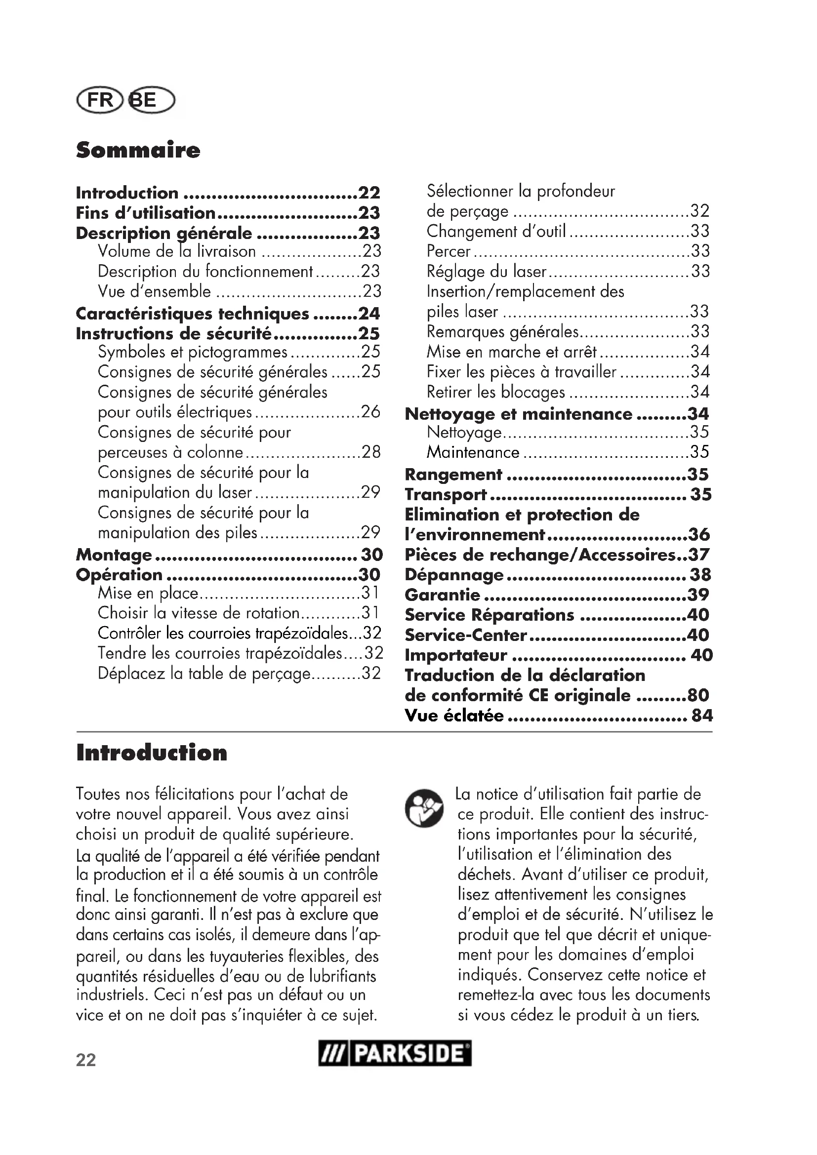 - Déplacez la table de perçage BEFR Fins d’utilisation La perceuse d‘établi est conçue pour le perçage dans le métal, le bois, le plastique et le carrelage. Des forets à embouts cy- lindriques d‘un diamètre de perçage de 1,5mm à 16mm peuvent être utilisés. L‘appareil est destiné à être utilisé dans le domaine du bricolage. Il n‘a pas été conçu pour une utilisation professionnelle constante. L‘appareil n‘est pas conçu pour être utilisé par des personnes de moins de 16 ans. Les jeunes âgés de plus de 16 ans ne doivent utiliser cet appareil que sous la sur- veillance d‘un adulte. Le fabricant ne peut être tenu pour responsa- ble des dommages causés par une utilisation inappropriée ou une manipulation erronée. Description générale Vous trouverez les images cor- respondantes à l’arrière et à l’avant de ce document, sur la couverture. Volume de la livraison Déballez l’appareil et vériez que la liv- raison est complète. Evacuez le matériel d’emballage comme il se doit. - Dalle - Table de perçage - Colonne tubulaire - Unité de moteur - 3 Bras de levage pour perçage - Dispositif de protection - Mandrin - Clé pour mandrin - Clé Allen - Étau - Piles 2 x 1,5 V, format AAA - Quincaillerie de montage - Notice d‘utilisation Description du fonctionnement Pour la fonction des pièces de service, veuil- lez vous reporter aux descriptions suivantes. Vue d‘ensemble p. 3223