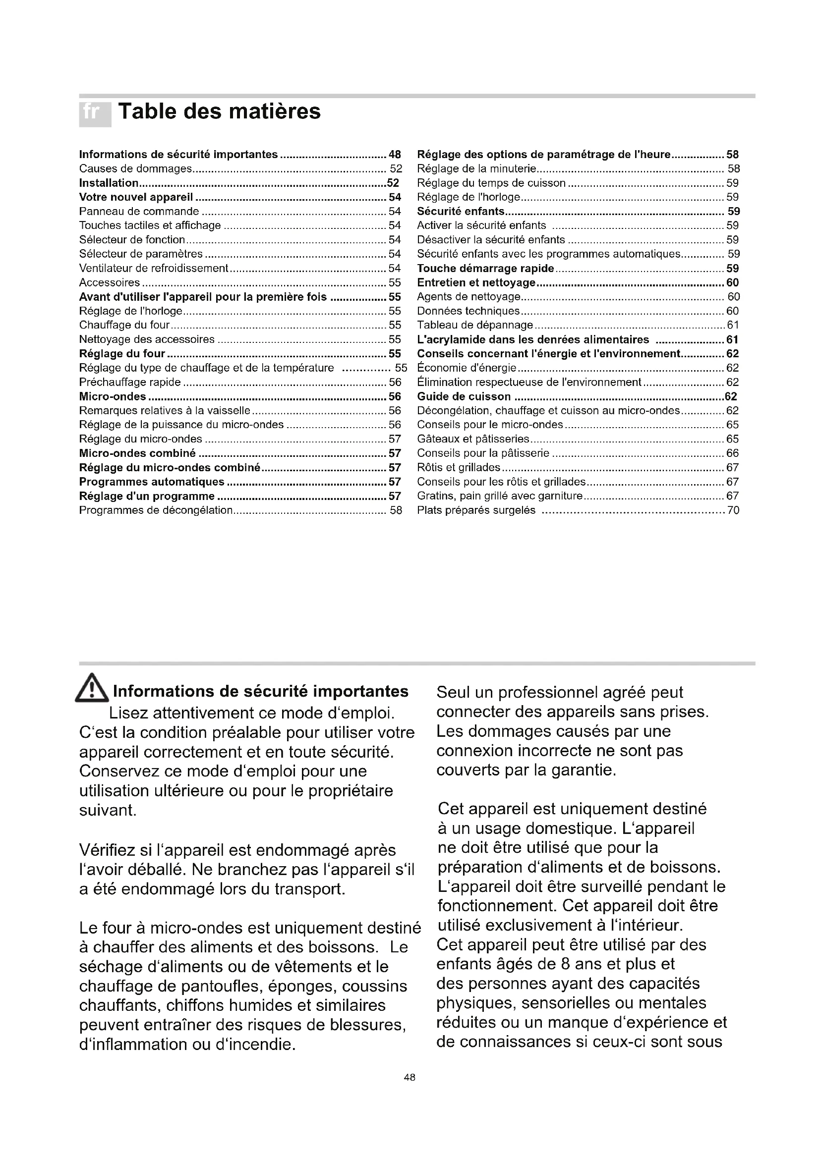 - Preheat the cooking compartment for 5minutes. ** Place the food in suitable, heat-resistant ovenware. Type of heating Temperature °C Microwave power in watts Cooking time in minutes48 Table des matières Informations de sécurité importantes .................................. 48 Causes de dommages.............................................................. 52 Installation ............................................................................... 52 Votre nouvel appareil ............................................................. 54 Panneau de commande ........................................................... 54 Touches tactiles et afchage .................................................... 54 Sélecteur de fonction ................................................................ 54 Sélecteur de paramètres .......................................................... 54 Ventilateur de refroidissement .................................................. 54 Accessoires .............................................................................. 55 Avant d'utiliser l'appareil pour la première fois .................. 55 Réglage de l'horloge ................................................................. 55 Chauffage du four ..................................................................... 55 Nettoyage des accessoires ...................................................... 55 Réglage du four ...................................................................... 55 Réglage du type de chauffage et de la température 55 Préchauffage rapide ................................................................. 56 Micro-ondes ............................................................................ 56 Remarques relatives à la vaisselle ........................................... 56 Réglage de la puissance du micro-ondes ................................ 56 Réglage du micro-ondes .......................................................... 57 Micro-ondes combiné ............................................................ 57 Réglage du micro-ondes combiné ........................................ 57 Programmes automatiques ................................................... 57 Réglage d'un programme ...................................................... 57 Programmes de décongélation................................................. 58 Réglage des options de paramétrage de l'heure ................. 58 Réglage de la minuterie............................................................ 58 Réglage du temps de cuisson .................................................. 59 Réglage de l'horloge ................................................................. 59 Sécurité enfants...................................................................... 59 Activer la sécurité enfants ....................................................... 59 Désactiver la sécurité enfants .................................................. 59 Sécurité enfants avec les programmes automatiques.............. 59 Touche démarrage rapide ...................................................... 59 Entretien et nettoyage ............................................................ 60 Agents de nettoyage................................................................. 60 Données techniques ................................................................. 60 Tableau de dépannage ............................................................. 61 L'acrylamide dans les denrées alimentaires ...................... 61 Conseils concernant l'énergie et l'environnement .............. 62 Économie d'énergie .................................................................. 62 Élimination respectueuse de l'environnement .......................... 62 Guide de cuisson ................................................................... 62 Décongélation, chauffage et cuisson au micro-ondes .............. 62 Conseils pour le micro-ondes ................................................... 65 Gâteaux et pâtisseries .............................................................. 65 Conseils pour la pâtisserie ....................................................... 66 Rôtis et grillades ....................................................................... 67 Conseils pour les rôtis et grillades ............................................ 67 Gratins, pain grillé avec garniture ............................................. 67 Plats préparés surgelés 70 Informations de sécurité importantes Lisez attentivement ce mode d‘emploi. C‘est la condition préalable pour utiliser votre appareil correctement et en toute sécurité. Conservez ce mode d‘emploi pour une utilisation ultérieure ou pour le propriétaire suivant. Vériez si l‘appareil est endommagé après l‘avoir déballé. Ne branchez pas l‘appareil s‘il a été endommagé lors du transport. Le four à micro-ondes est uniquement destiné à chauffer des aliments et des boissons. Le séchage d‘aliments ou de vêtements et le chauffage de pantoues, éponges, coussins chauffants, chiffons humides et similaires peuvent entraîner des risques de blessures, d‘inammation ou d‘incendie. Seul un professionnel agréé peut connecter des appareils sans prises. Les dommages causés par une connexion incorrecte ne sont pas couverts par la garantie. Cet appareil est uniquement destiné à un usage domestique. L‘appareil ne doit être utilisé que pour la préparation d‘aliments et de boissons. L‘appareil doit être surveillé pendant le fonctionnement. Cet appareil doit être utilisé exclusivement à l‘intérieur. Cet appareil peut être utilisé par des enfants âgés de 8 ans et plus et des personnes ayant des capacités physiques, sensorielles ou mentales réduites ou un manque d‘expérience et de connaissances si ceux-ci sont sous fr49 surveillance ou ont reçu des instructions concernant l‘utilisation de l‘appareil de manière