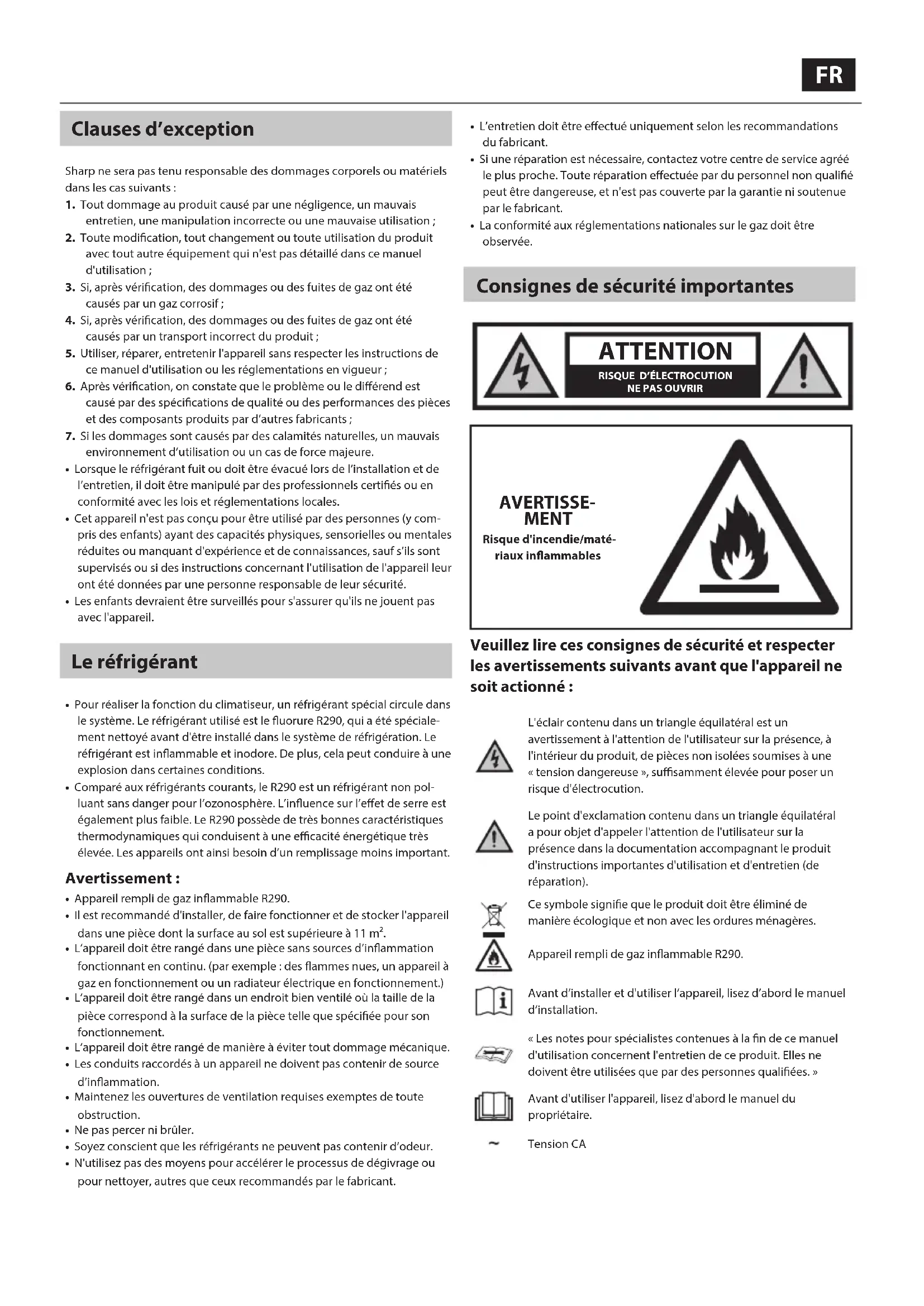 AVERTISSE- MENT Risque d'incendie/maté-riaux inammables Veuillez lire ces consignes de sécurité et respecter les avertissements suivants avant que l'appareil ne soit actionné : L'éclair contenu dans un triangle équilatéral est un avertissement à l'attention de l'utilisateur sur la présence, à l'intérieur du produit, de pièces non isolées soumises à une «tension dangereuse», susamment élevée pour poser un risque d'électrocution.Le point d'exclamation contenu dans un triangle équilatéral a pour objet d'appeler l'attention de l'utilisateur sur la présence dans la documentation accompagnant le produit d'instructions importantes d'utilisation et d'entretien (de réparation).Ce symbole signie que le produit doit être éliminé de manière écologique et non avec les ordures ménagères.Appareil rempli de gaz inammable R290.Avant d’installer et d'utiliser l’appareil, lisez d’abord le manuel d’installation.«Les notes pour spécialistes contenues à la n de ce manuel d'utilisation concernent l'entretien de ce produit. Elles ne doivent être utilisées que par des personnes qualiées.»Avant d'utiliser l'appareil, lisez d'abord le manuel du propriétaire.Tension CA