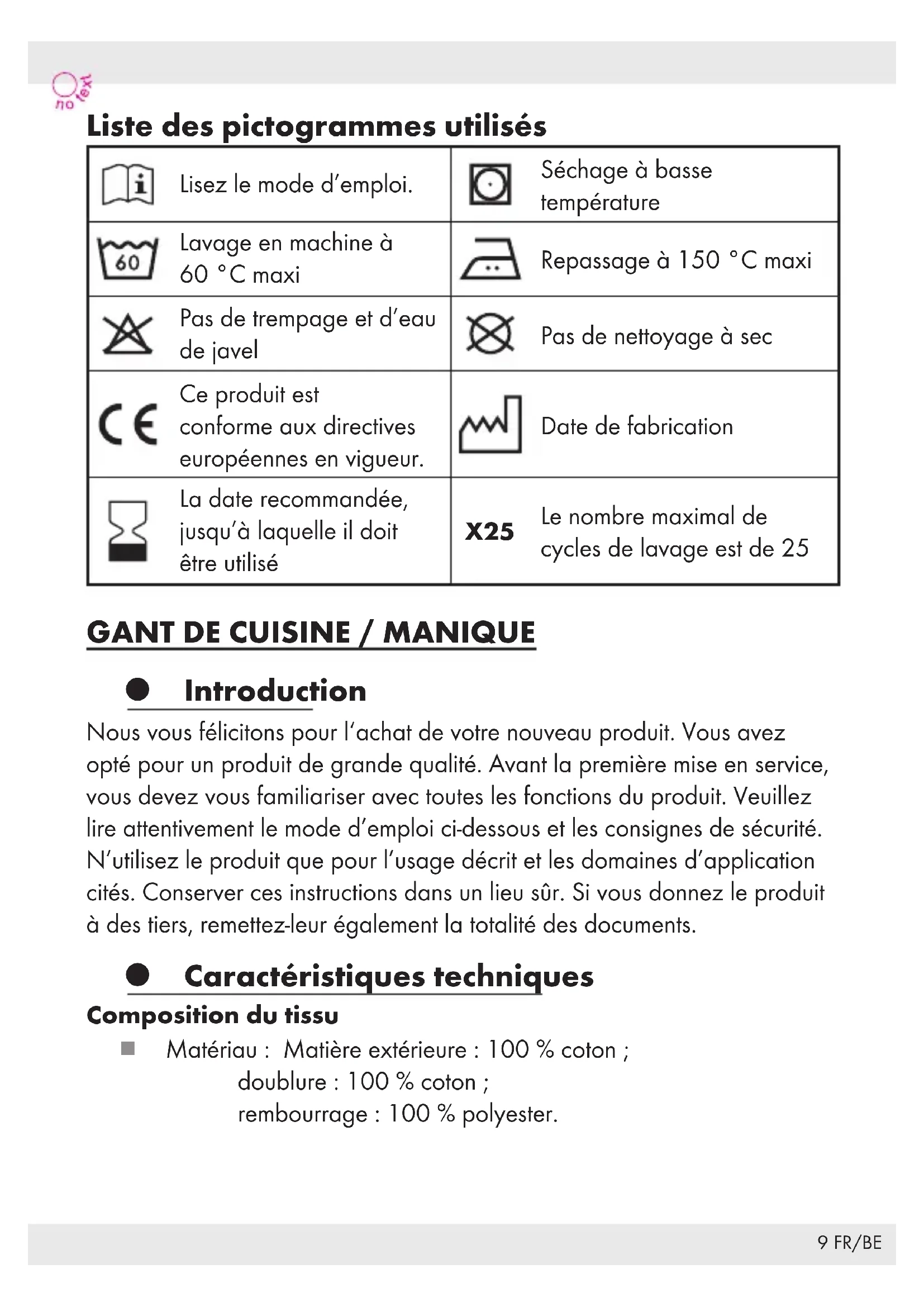 Le produit a été testé selon l'ISO 12127-1:2015. Il peut protéger l'utilisateur lors d'un contact avec une température jusqu'à 250°C pendant 15 secondes maximum. Il peut constituer une protection pour un usage domestique lors de l'utilisation de casseroles et de plaques électriques. - Ce produit peut subir un maximum de 25 cycles de lavage conformément aux instructions d'entretien. Dès que ce nombre maximal est atteint, la protection requise ne peut plus être garantie. - Date de fabrication: 05/2020. Dans l'emballage original fermé, la date de péremption est de 2 ans. Dès que le produit est ouvert et utilisé, il est important de respecter les recommandations d'utilisation, de nettoyage et de rangement, conformément aux chapitres correspondants. - Les gants de cuisine et maniques doivent être utilisés seulement lorsqu'ils sont secs et seulement pour des laps de temps courts.