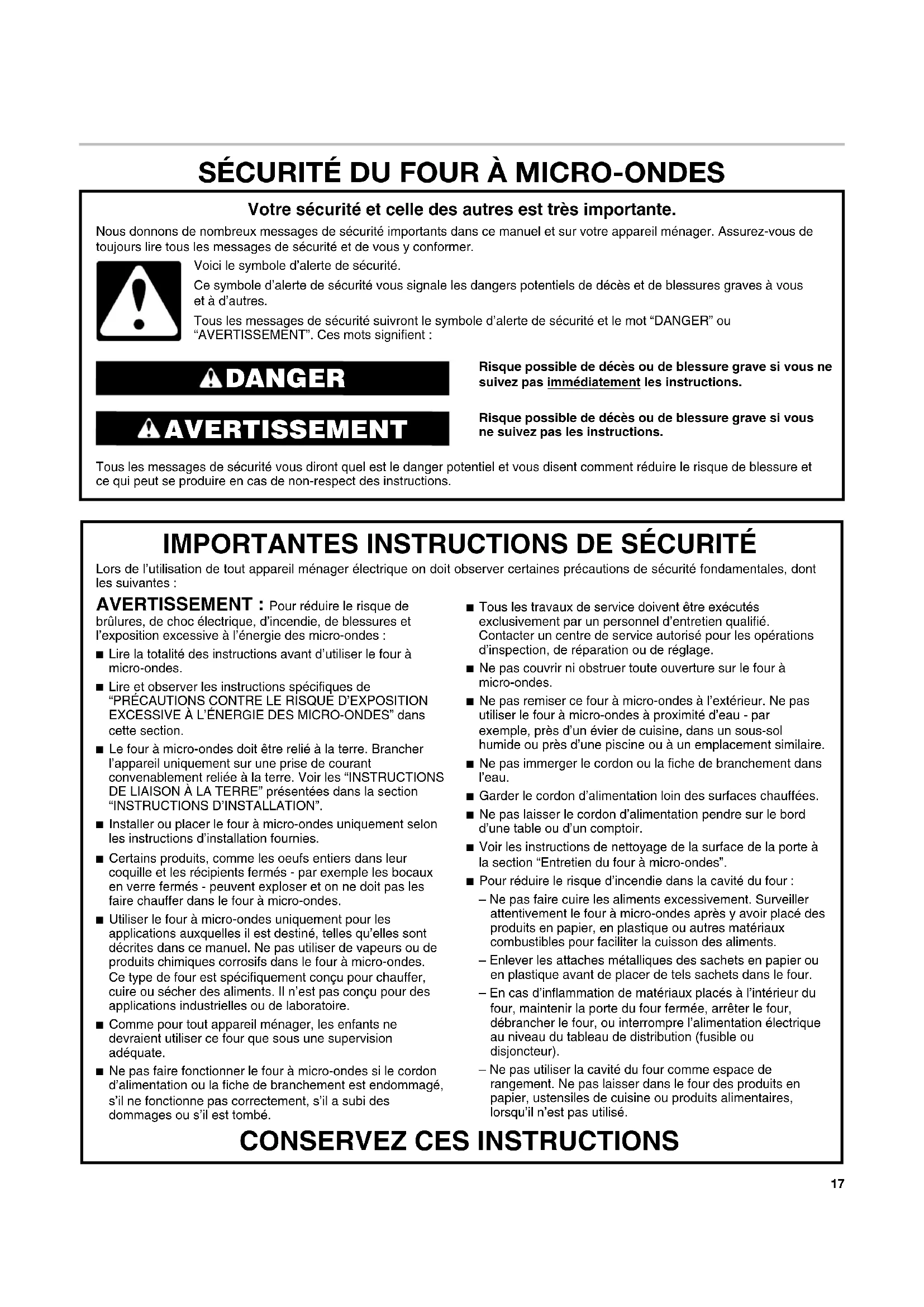 brûlures, de choc électrique, d’incendie, de blessures et l’exposition excessive à l’énergie des micro-ondes : Lire la totalité des instructions avant d’utiliser le four à micro-ondes. Lire et observer les instructions spécifiques de “PRÉCAUTIONS CONTRE LE RISQUE D’EXPOSITION EXCESSIVE À L’ÉNERGIE DES MICRO-ONDES” dans cette section. ■ Le four à micro-ondes doit être relié à la terre. Brancher l’appareil uniquement sur une prise de courant convenablement reliée à la terre. Voir les “INSTRUCTIONS DE LIAISON À LA TERRE” présentées dans la section “INSTRUCTIONS D’INSTALLATION”.■ Installer ou placer le four à micro-ondes uniquement selon les instructions d’installation fournies.■ Certains produits, comme les oeufs entiers dans leur coquille et les récipients fermés - par exemple les bocaux en verre fermés - peuvent exploser et on ne doit pas les faire chauffer dans le four à micro-ondes. ■ Utiliser le four à micro-ondes uniquement pour les applications auxquelles il est destiné, telles qu’elles sont décrites dans ce manuel. Ne pas utiliser de vapeurs ou de produits chimiques corrosifs dans le four à micro-ondes. Ce type de four est spécifiquement conçu pour chauffer, cuire ou sécher des aliments. Il n’est pas conçu pour des applications industrielles ou de laboratoire. ■ Comme pour tout appareil ménager, les enfants ne devraient utiliser ce four que sous une supervision adéquate. ■ Ne pas faire fonctionner le four à micro-ondes si le cordon d’alimentation ou la fiche de branchement est endommagé, s’il ne fonctionne pas correctement, s’il a subi des dommages ou s’il est tombé.■ Tous les travaux de service doivent être exécutés exclusivement par un personnel d’entretien qualifié. Contacter un centre de service autorisé pour les opérations d’inspection, de réparation ou de réglage. ■ Ne pas couvrir ni obstruer toute ouverture sur le four à micro-ondes. ■ Ne pas remiser ce four à micro-ondes à l’extérieur. Ne pas utiliser le four à micro-ondes à proximité d’eau - par exemple, près d’un évier de cuisine, dans un sous-sol humide ou près d’une piscine ou à un emplacement similaire.■ Ne pas immerger le cordon ou la fiche de branchement dans l’eau. ■ Garder le cordon d’alimentation loin des surfaces chauffées. ■ Ne pas laisser le cordon d’alimentation pendre sur le bord d’une table ou d’un comptoir. ■ Voir les instructions de nettoyage de la surface de la porte à la section “Entretien du four à micro-ondes”.■ Pour réduire le risque d’incendie dans la cavité du four :– Ne pas faire cuire les aliments excessivement. Surveiller attentivement le four à micro-ondes après y avoir placé des produits en papier, en plastique ou autres matériaux combustibles pour faciliter la cuisson des aliments. – Enlever les attaches métalliques des sachets en papier ou en plastique avant de placer de tels sachets dans le four.– En cas d’inflammation de matériaux placés à l’intérieur du four, maintenir la porte du four fermée, arrêter le four, débrancher le four, ou interrompre l’alimentation électrique au niveau du tableau de distribution (fusible ou disjoncteur).– Ne pas utiliser la cavité du four comme espace de rangement. Ne pas laisser dans le four des produits en papier, ustensiles de cuisine ou produits alimentaires, lorsqu’il n’est pas utilisé.18