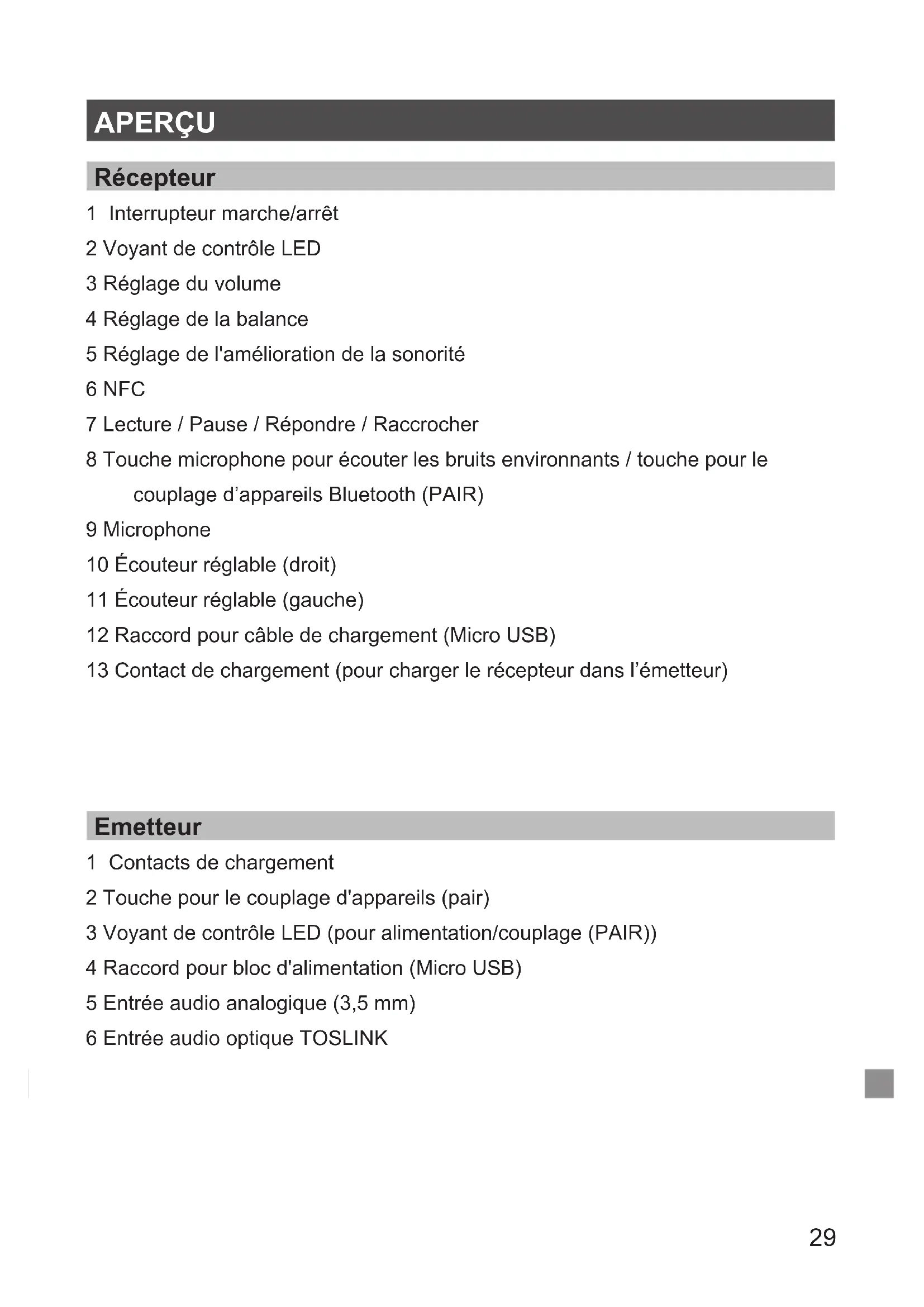 8 Touche microphone pour écouter les bruits environnants / touche pour le couplage d'appareils Bluetooth (PAIR)