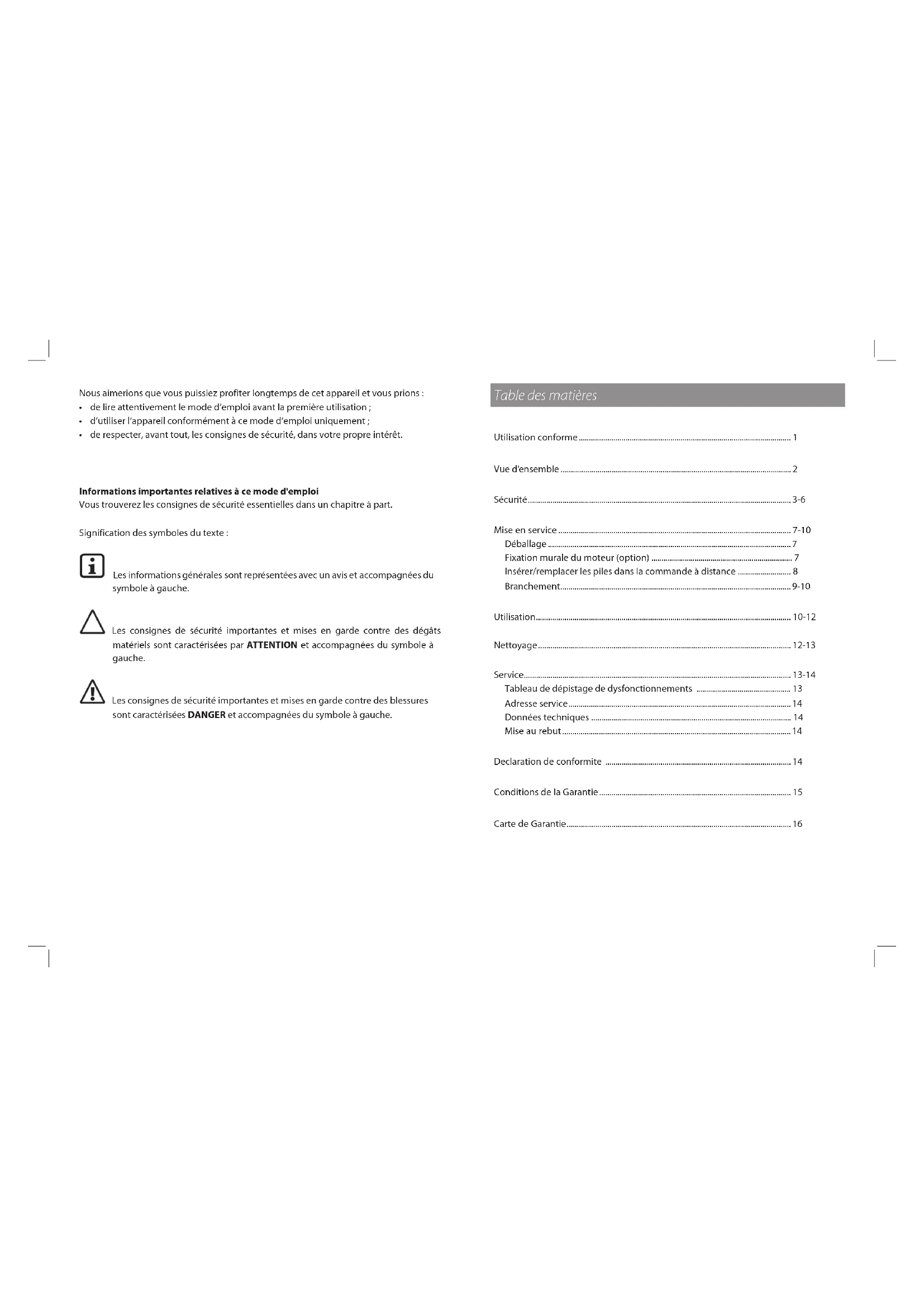 - derespecter,avanttout,lesconsignesdesécurité,dansvotrepropreintérêt. Informations importantes relatives à ce mode d'emploi Vous trouverez les consignes de sécurité essentielles dans un chapitre à part. Signification des symboles du texte : Les informations générales sont représentées avec un avis et accompagnées du symbole à gauche. Les consignes de sécurité importantes et mises en garde contre des dégâts matériels sont caractérisées par ATTENTION et accompagnées du symbole à gauche. Les consignes de sécurité importantes et mises en garde contre des blessures sont caractérisées DANGER et accompagnées du symbole à gauche.1 2 Utilisation conforme Vue d'ensemble Pièces et éléments de commande 1 Repose-têtegonflable 2 Moteur avec commande 3 Câble d'alimentation 4 Commande à distance 5 Tuyau d’alimentation en air 6 Raccordement du tuyau 7 Tapis Sans illustration : sachet avec 2 vis et 2 chevilles Cet appareil transforme votre baignoire en bain à bulles d'air.