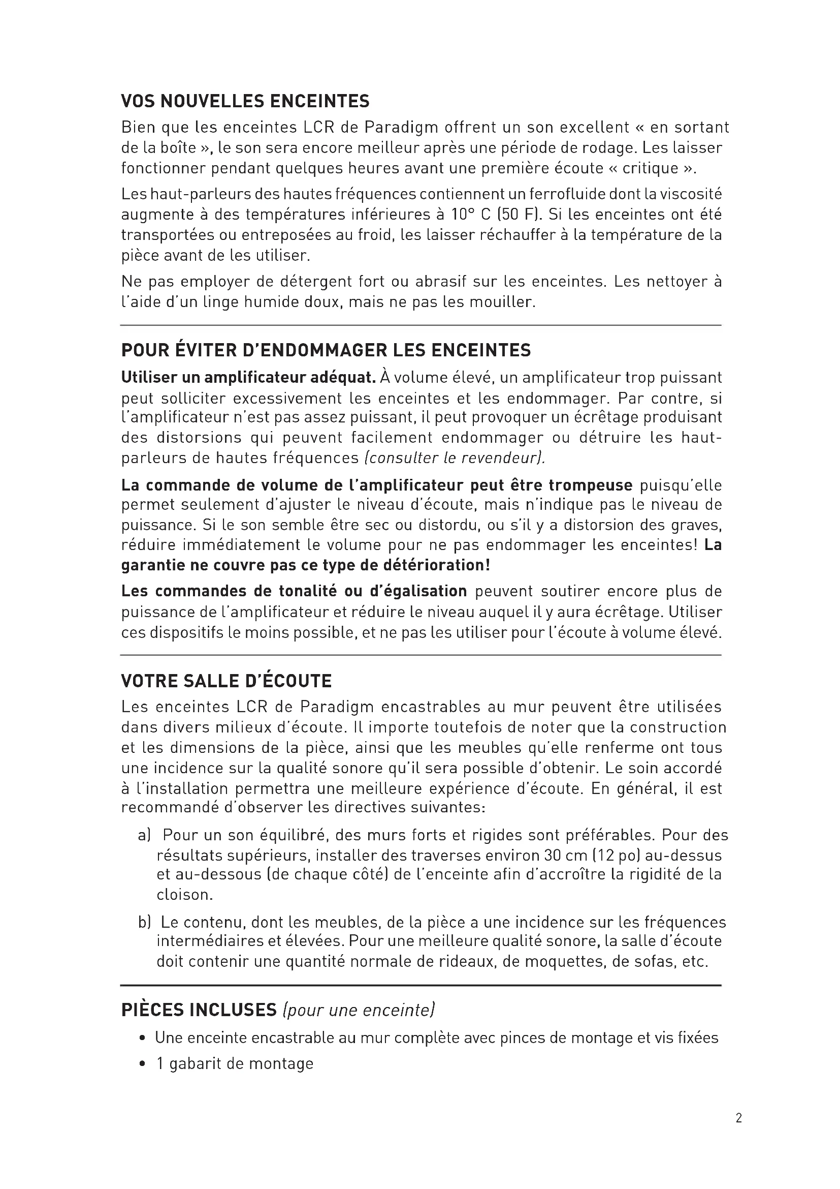 Bien que les enceintes LCR de Paradigm offrent un son excellent « en sortant de la boîte », le son sera encore meilleur après une période de rodage. Les laisser fonctionner pendant quelques heures avant une première écoute « critique ». Les haut-parleurs des hautes fréquences contiennent un ferrofluide dont la viscosité augmente à des températures inférieures à 10° C (50 F). Si les enceintes ont été transportées ou entreposées au froid, les laisser réchauffer à la température de la pièce avant de les utiliser. Ne pas employer de détergent fort ou abrasif sur les enceintes. Les nettoyer à l’aide d’un linge humide doux, mais ne pas les mouiller.