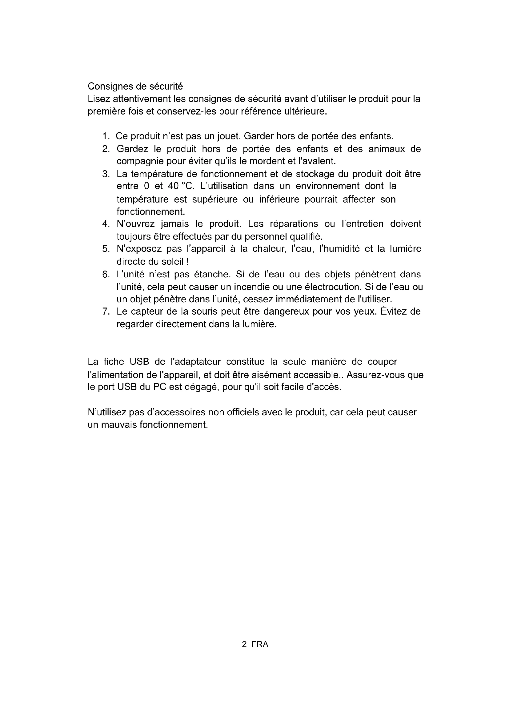 N'utilisez pas d'accessoires non officiels avec le produit, car cela peut causer un mauvais fonctionnement.