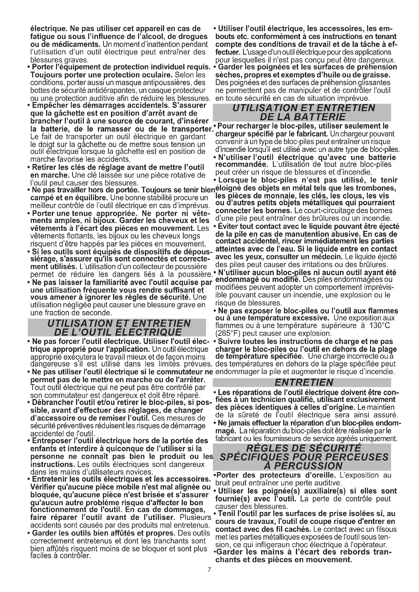 - Suivre toutes les instructions de charge et ne pas charger le bloc-piles ou l’outil en dehors de la plage de température spéciée. Une charge incorrecte ou à des températures en dehors de la plage spéciée peut endommager la pile et augmenter le risque d’incendie. ENTRETIEN