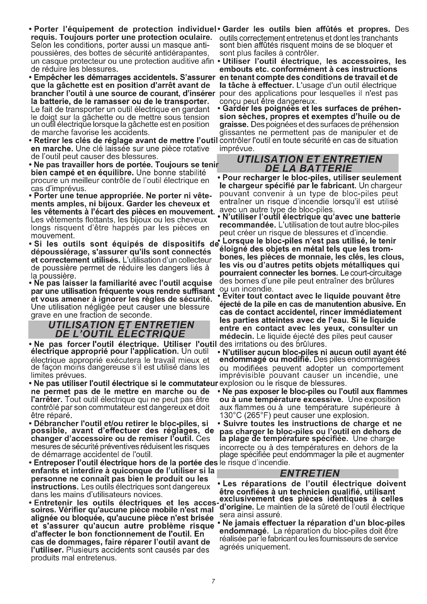 - Suivre toutes les instructions de charge et ne pas charger le bloc-piles ou l’outil en dehors de la plage de température spéciée. Une charge incorrecte ou à des températures en dehors de la plage spéciée peut endommager la pile et augmenter le risque d’incendie. ENTRETIEN