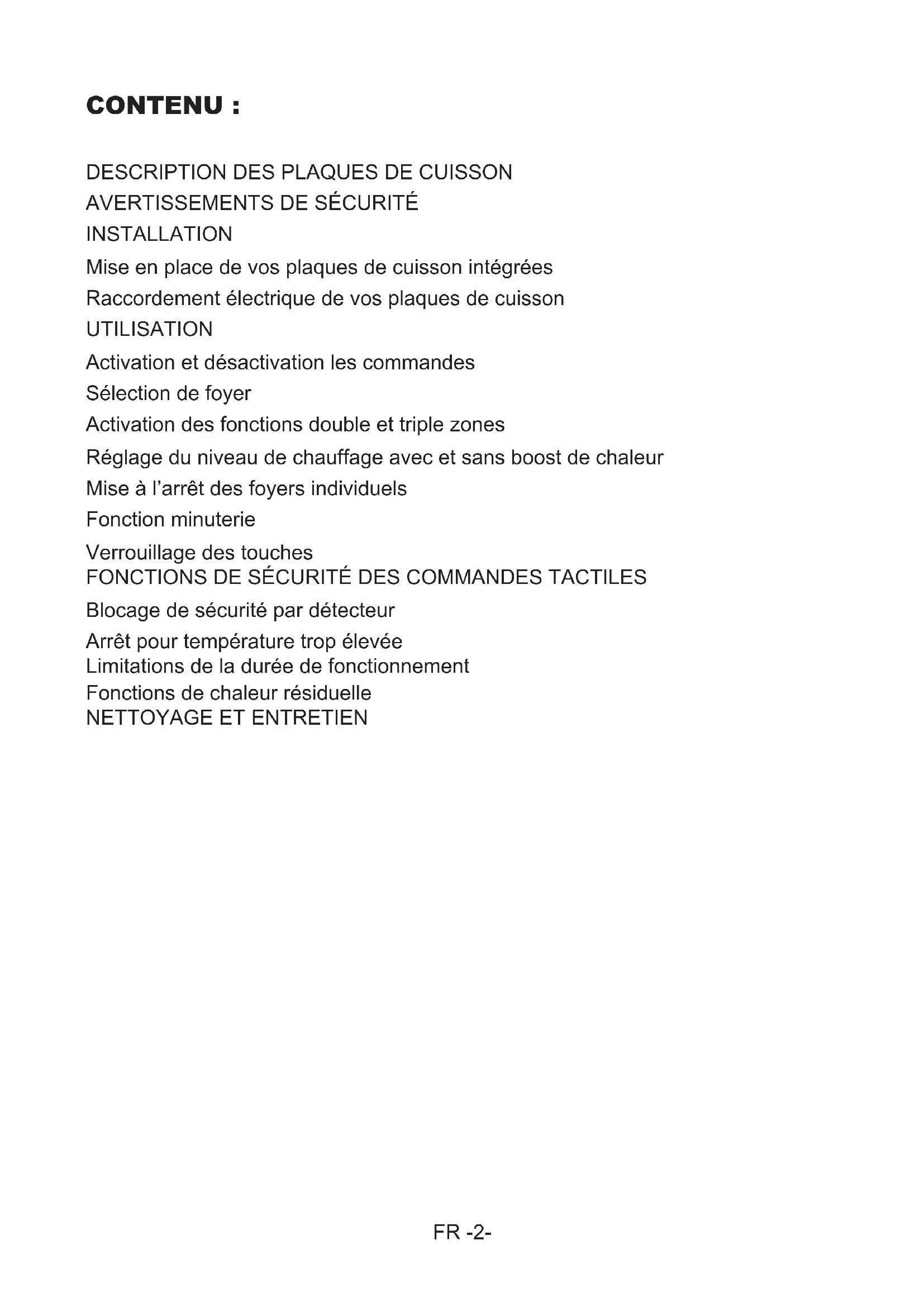 INSTALLATION Mise en place de vos plaques de cuisson intégrées Raccordement électrique de vos plaques de cuisson UTILISATION Activation et désactivation les commandes Sélection de foyer Activation des fonctions double et triple zones Réglage du niveau de chauffage avec et sans boost de chaleur Mise à l’arrêt des foyers individuels Fonction minuterie Verrouillage des touches FONCTIONS DE SÉCURITÉ DES COMMANDES TACTILES Blocage de sécurité par détecteur Arrêt pour température trop élevée Limitations de la durée de fonctionnement Fonctions de chaleur résiduelle
