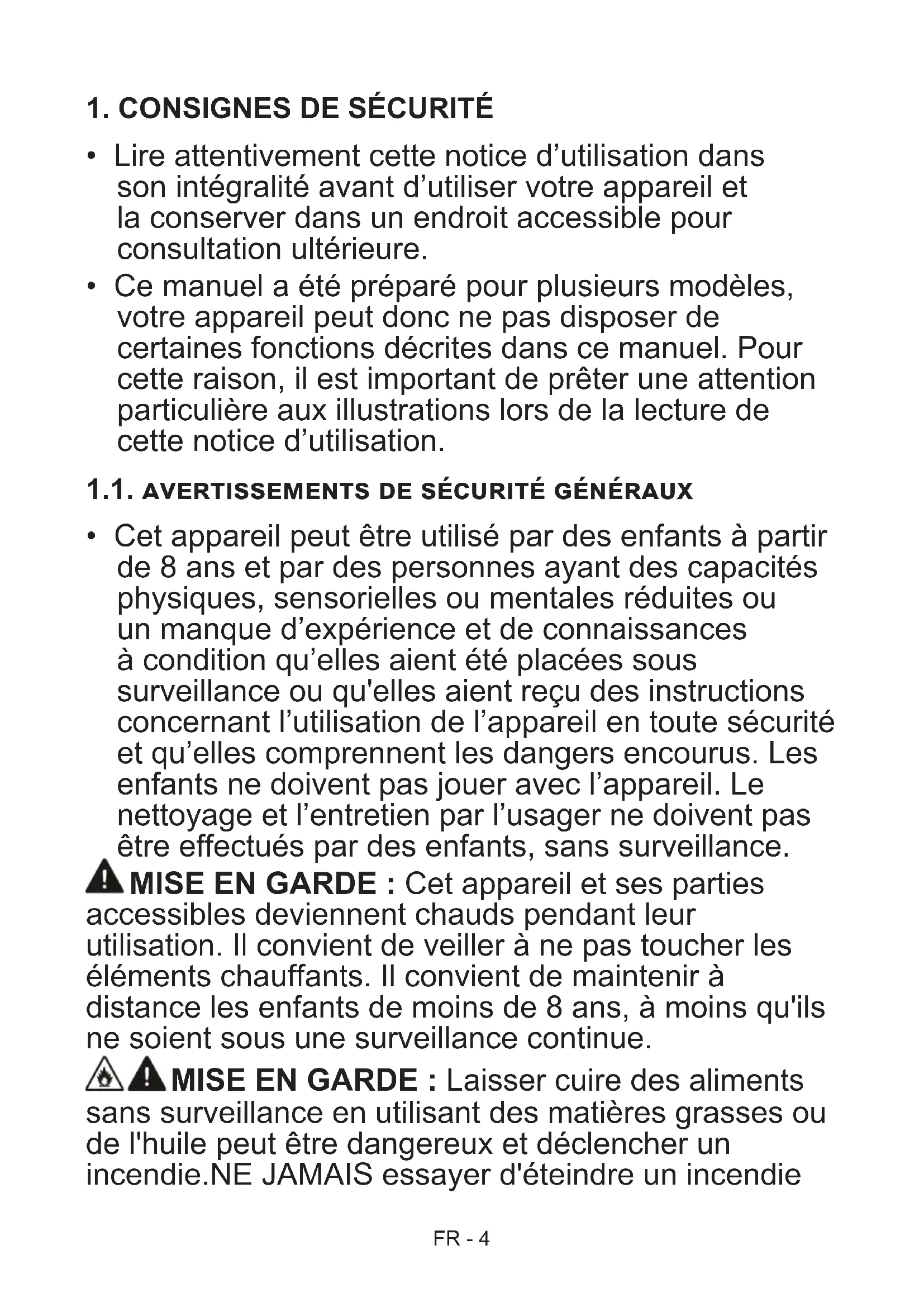 - Cet appareil peut être utilisé par des enfants à partir de 8 ans et par des personnes ayant des capacités physiques, sensorielles ou mentales réduites ou un manque d’expérience et de connaissances à condition qu’elles aient été placées sous surveillance ou qu'elles aient reçu des instructions concernant l’utilisation de l’appareil en toute sécurité et qu’elles comprennent les dangers encourus. Les enfants ne doivent pas jouer avec l’appareil. Le nettoyage et l’entretien par l’usager ne doivent pas être effectués par des enfants, sans surveillance. MISE EN GARDE : Cet appareil et ses parties accessibles deviennent chauds pendant leur utilisation. Il convient de veiller à ne pas toucher les éléments chauffants. Il convient de maintenir à distance les enfants de moins de 8 ans, à moins qu'ils ne soient sous une surveillance continue. MISE EN GARDE : Laisser cuire des aliments sans surveillance en utilisant des matières grasses ou de l'huile peut être dangereux et déclencher un incendie.NE JAMAIS essayer d'éteindre un incendieFR - 5 avec de l'eau, mais arrêter l'appareil puis couvrir les flammes par exemple avec un couvercle ou une couverture anti-feu. MISE EN GARDE : Risque d'incendie: ne pas entreposer d'objets sur les surfaces de cuisson.