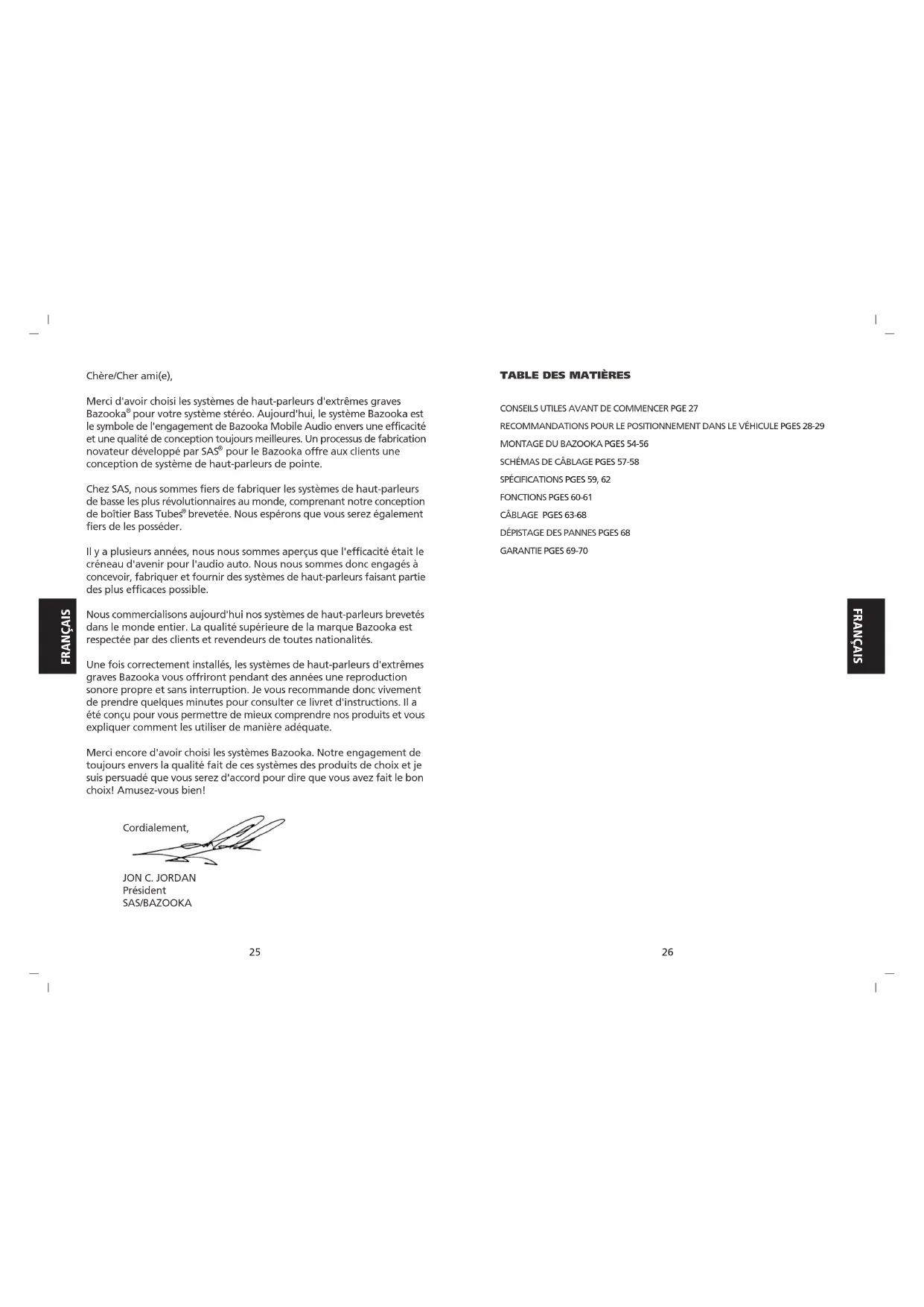 brevetée. Nous espérons que vous serez également fiers de les posséder. Il y a plusieurs années, nous nous sommes aperçus que l'efficacité était le créneau d'avenir pour l'audio auto. Nous nous sommes donc engagés à concevoir, fabriquer et fournir des systèmes de haut-parleurs faisant partie des plus efficaces possible. Nous commercialisons aujourd'hui nos systèmes de haut-parleurs brevetés dans le monde entier. La qualité supérieure de la marque Bazooka est respectée par des clients et revendeurs de toutes nationalités. Une fois correctement installés, les systèmes de haut-parleurs d'extrêmes graves Bazooka vous offriront pendant des années une reproduction sonore propre et sans interruption. Je vous recommande donc vivement de prendre quelques minutes pour consulter ce livret d'instructions. Il a été conçu pour vous permettre de mieux comprendre nos produits et vous expliquer comment les utiliser de manière adéquate. Merci encore d'avoir choisi les systèmes Bazooka. Notre engagement de toujours envers la qualité fait de ces systèmes des produits de choix et je suis persuadé que vous serez d'accord pour dire que vous avez fait le bon choix! Amusez-vous bien! Cordialement,