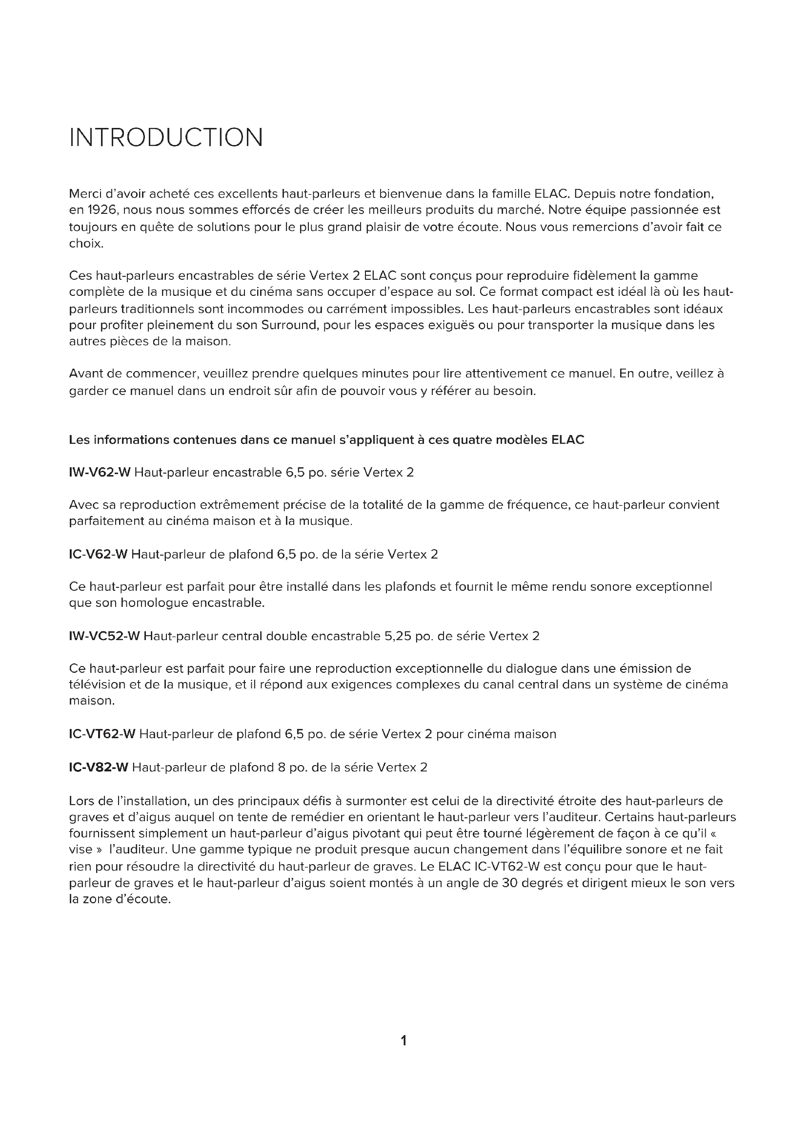 Merci d'avoir acheté ces excellents haut-parleurs et bienvenue dans la famille ELAC. Depuis notre fondation, en 1926, nous nous sommes efforcés de créer les meilleurs produits du marché. Notre équipe passionnée est toujours en quête de solutions pour le plus grand plaisir de votre écoute. Nous vous remercions d'avoir fait ce choix.