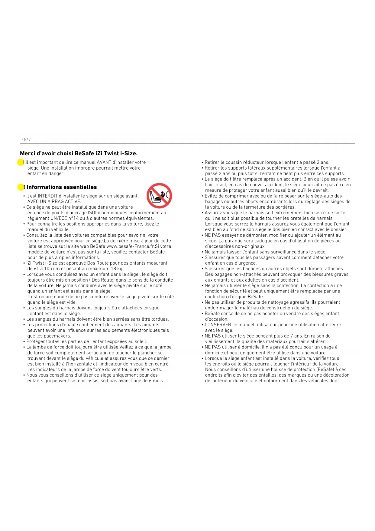 - Lorsque le siège enfant est installé dans la voiture, vérifiez tous les endroits où le siège pourrait toucher l’intérieur de la voiture. Nous conseillons d’utiliser une housse de protection (BeSafe) à ces endroits afin d’éviter des entailles, des marques ou une décoloration de l’intérieur du véhicule et notamment dans les véhicules dont ! Il est important de lire ce manuel AVANT d’installer votre siège. Une installation impropre pourrait mettre votre enfant en danger. Merci d’avoir choisi BeSafe iZi Twist i-Size.48 49