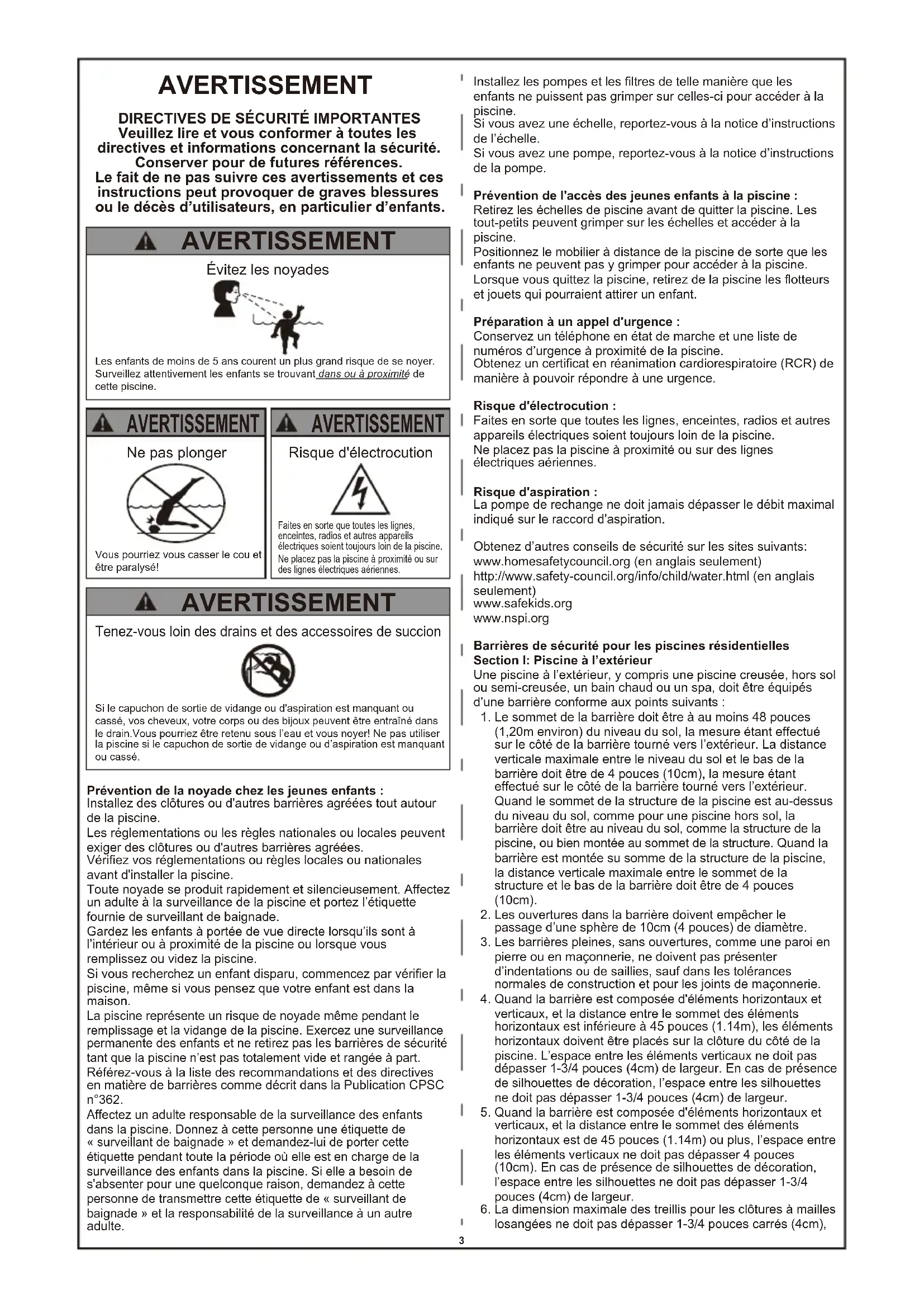 Veuillez lire et vous conformer à toutes les directives et informations concernant la sécurité. Conserver pour de futures références. Le fait de ne pas suivre ces avertissements et ces instructions peut provoquer de graves blessures ou le décès d’utilisateurs, en particulier d’enfants. Prévention de la noyade chez les jeunes enfants : Installez des clôtures ou d'autres barrières agréées tout autour de la piscine. Les réglementations ou les règles nationales ou locales peuvent exiger des clôtures ou d'autres barrières agréées. Vérifiez vos réglementations ou règles locales ou nationales avant d'installer la piscine. Toute noyade se produit rapidement et silencieusement. Affectez un adulte à la surveillance de la piscine et portez l’étiquette fournie de surveillant de baignade. Gardez les enfants à portée de vue directe lorsqu’ils sont à l’intérieur ou à proximité de la piscine ou lorsque vous remplissez ou videz la piscine. Si vous recherchez un enfant disparu, commencez par vérifier la piscine, même si vous pensez que votre enfant est dans la maison. La piscine représente un risque de noyade même pendant le remplissage et la vidange de la piscine. Exercez une surveillance permanente des enfants et ne retirez pas les barrières de sécurité tant que la piscine n’est pas totalement vide et rangée à part. Référez-vous à la liste des recommandations et des directives en matière de barrières comme décrit dans la Publication CPSC n°362. Affectez un adulte responsable de la surveillance des enfants dans la piscine. Donnez à cette personne une étiquette de « surveillant de baignade » et demandez-lui de porter cette étiquette pendant toute la période où elle est en charge de la surveillance des enfants dans la piscine. Si elle a besoin de s'absenter pour une quelconque raison, demandez à cette personne de transmettre cette étiquette de « surveillant de baignade » et la responsabilité de la surveillance à un autre adulte. Installez les pompes et les filtres de telle manière que les enfants ne puissent pas grimper sur celles-ci pour accéder à la piscine. Si vous avez une échelle, reportez-vous à la notice d’instructions de l’échelle. Si vous avez une pompe, reportez-vous à la notice d’instructions de la pompe. Prévention de l'accès des jeunes enfants à la piscine : Retirez les échelles de piscine avant de quitter la piscine. Les tout-petits peuvent grimper sur les échelles et accéder à la piscine. Positionnez le mobilier à distance de la piscine de sorte que les enfants ne peuvent pas y grimper pour accéder à la piscine. Lorsque vous quittez la piscine, retirez de la piscine les flotteurs et jouets qui pourraient attirer un enfant. Préparation à un appel d'urgence : Conservez un téléphone en état de marche et une liste de numéros d’urgence à proximité de la piscine. Obtenez un certificat en réanimation cardiorespiratoire (RCR) de manière à pouvoir répondre à une urgence. Risque d'électrocution : Faites en sorte que toutes les lignes, enceintes, radios et autres appareils électriques soient toujours loin de la piscine. Ne placez pas la piscine à proximité ou sur des lignes électriques aériennes. Risque d'aspiration : La pompe de rechange ne doit jamais dépasser le débit maximal indiqué sur le raccord d'aspiration. Obtenez d’autres conseils de sécurité sur les sites suivants: www.homesafetycouncil.org (en anglais seulement) http://www.safety-council.org/info/child/water.html (en anglais seulement) www.safekids.org www.nspi.org Barrières de sécurité pour les piscines résidentielles Section I: Piscine à l’extérieur Une piscine à l’extérieur, y compris une piscine creusée, hors sol ou semi-creusée, un bain chaud ou un spa, doit être équipés d’une barrière conforme aux points suivants :