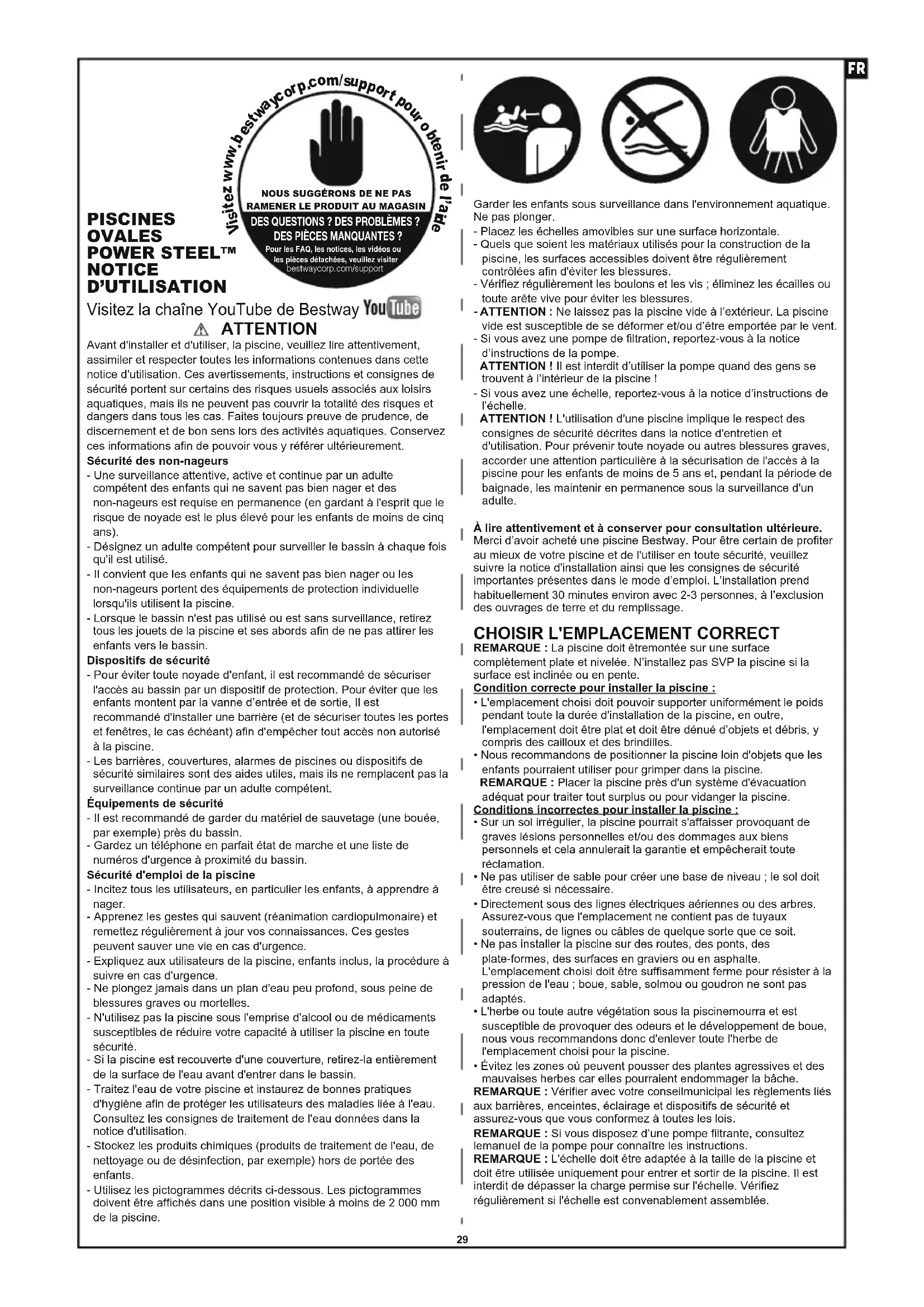 2. Quando la piscina è completamente asciutta, spargere polvere di talco per evitare che le pareti della piscina si incollino tra loro, quindi ripiegarla con cura. Se la piscina non è completamente asciutta, potrebbe ammuffirsi e il rivestimento della piscina potrebbe danneggiarsi. 3. Conservare il rivestimento e gli accessori in un luogo asciutto con una temperatura moderata tra 5ºC/41ºF e 38ºC/100ºF. 4. Durante i periodi piovosi, la piscina e i relativi accessori devono essere conservati attenendosi alle istruzioni sopra fornite. 5. Se la piscina non viene svuotata correttamente, potrebbero verificarsi gravi lesioni personali e/o danni a oggetti e beni. 6. Si consiglia vivamente di smontare la piscina durante la bassa stagione (mesi invernali). Conservare in un luogo asciutto e fuori dalla portata dei bambini.FR PISCINES OVALES POWER STEEL™ NOTICE D’UTILISATION ATTENTION Avant d'installer et d'utiliser, la piscine, veuillez lire attentivement, assimiler et respecter toutes les informations contenues dans cette notice d'utilisation. Ces avertissements, instructions et consignes de sécurité portent sur certains des risques usuels associés aux loisirs aquatiques, mais ils ne peuvent pas couvrir la totalité des risques et dangers dans tous les cas. Faites toujours preuve de prudence, de discernement et de bon sens lors des activités aquatiques. Conservez ces informations afin de pouvoir vous y référer ultérieurement.Sécurité des non-nageurs- Une surveillance attentive, active et continue par un adulte compétent des enfants qui ne savent pas bien nager et des non-nageurs est requise en permanence (en gardant à l'esprit que le risque de noyade est le plus élevé pour les enfants de moins de cinq ans).- Désignez un adulte compétent pour surveiller le bassin à chaque fois qu'il est utilisé.- Il convient que les enfants qui ne savent pas bien nager ou les non-nageurs portent des équipements de protection individuelle lorsqu'ils utilisent la piscine.- Lorsque le bassin n'est pas utilisé ou est sans surveillance, retirez tous les jouets de la piscine et ses abords afin de ne pas attirer les enfants vers le bassin.Dispositifs de sécurité- Pour éviter toute noyade d'enfant, il est recommandé de sécuriser l'accès au bassin par un dispositif de protection. Pour éviter que les enfants montent par la vanne d’entrée et de sortie, Il est recommandé d'installer une barrière (et de sécuriser toutes les portes et fenêtres, le cas échéant) afin d'empêcher tout accès non autorisé à la piscine.- Les barrières, couvertures, alarmes de piscines ou dispositifs de sécurité similaires sont des aides utiles, mais ils ne remplacent pas la surveillance continue par un adulte compétent.Équipements de sécurité- Il est recommandé de garder du matériel de sauvetage (une bouée, par exemple) près du bassin.- Gardez un téléphone en parfait état de marche et une liste de numéros d'urgence à proximité du bassin.Sécurité d'emploi de la piscine- Incitez tous les utilisateurs, en particulier les enfants, à apprendre à nager.- Apprenez les gestes qui sauvent (réanimation cardiopulmonaire) et remettez régulièrement à jour vos connaissances. Ces gestes peuvent sauver une vie en cas d'urgence.- Expliquez aux utilisateurs de la piscine, enfants inclus, la procédure à suivre en cas d'urgence.- Ne plongez jamais dans un plan d'eau peu profond, sous peine de blessures graves ou mortelles.- N'utilisez pas la piscine sous l'emprise d'alcool ou de médicaments susceptibles de réduire votre capacité à utiliser la piscine en toute sécurité.- Si la piscine est recouverte d'une couverture, retirez-la entièrement de la surface de l'eau avant d'entrer dans le bassin.- Traitez l'eau de votre piscine et instaurez de bonnes pratiques d'hygiène afin de protéger les utilisateurs des maladies liée à l'eau. Consultez les consignes de traitement de l'eau données dans la notice d'utilisation.- Stockez les produits chimiques (produits de traitement de l'eau, de nettoyage ou de désinfection, par exemple) hors de portée des enfants.- Utilisez les pictogrammes décrits ci-dessous. Les pictogrammes doivent être affichés dans une position visible à moins de 2 000 mm de la piscine.Garder les enfants sous surveillance dans l'environnement aquatique. Ne pas plonger.- Placez les échelles amovibles sur une surface horizontale.- Quels que soient les matériaux utilisés pour la construction de la piscine, les surfaces accessibles doivent être régulièrement contrôlées afin d'éviter les blessures.- Vérifiez régulièrement les boulons et les vis ; éliminez les écailles ou toute arête vive pour éviter les blessures.- ATTENTION : Ne laissez pas la piscine vide à l’extérieur. La piscine vide est susceptible de se déformer et/ou d’être emportée par le vent.- Si vous avez une pompe de filtration, reportez-vous à la notice d’instructions de la pompe. ATTENTION ! Il est interdit d’utiliser la pompe quand des gens se trouvent à l’intérieur de la piscine !- Si vous avez une échelle, reportez-vous à la notice d’instructions de l’échelle. ATTENTION ! L'utilisation d'une piscine implique le respect des consignes de sécurité décrites dans la notice d'entretien et d'utilisation. Pour prévenir toute noyade ou autres blessures graves, accorder une attention particulière à la sécurisation de l'accès à la piscine pour les enfants de moins de 5 ans et, pendant la période de baignade, les maintenir en permanence sous la surveillance d'un adulte. À lire attentivement et à conserver pour consultation ultérieure.Merci d’avoir acheté une piscine Bestway. Pour être certain de profiter au mieux de votre piscine et de l'utiliser en toute sécurité, veuillez suivre la notice d'installation ainsi que les consignes de sécurité importantes présentes dans le mode d’emploi. L’installation prend habituellement 30 minutes environ avec 2-3 personnes, à