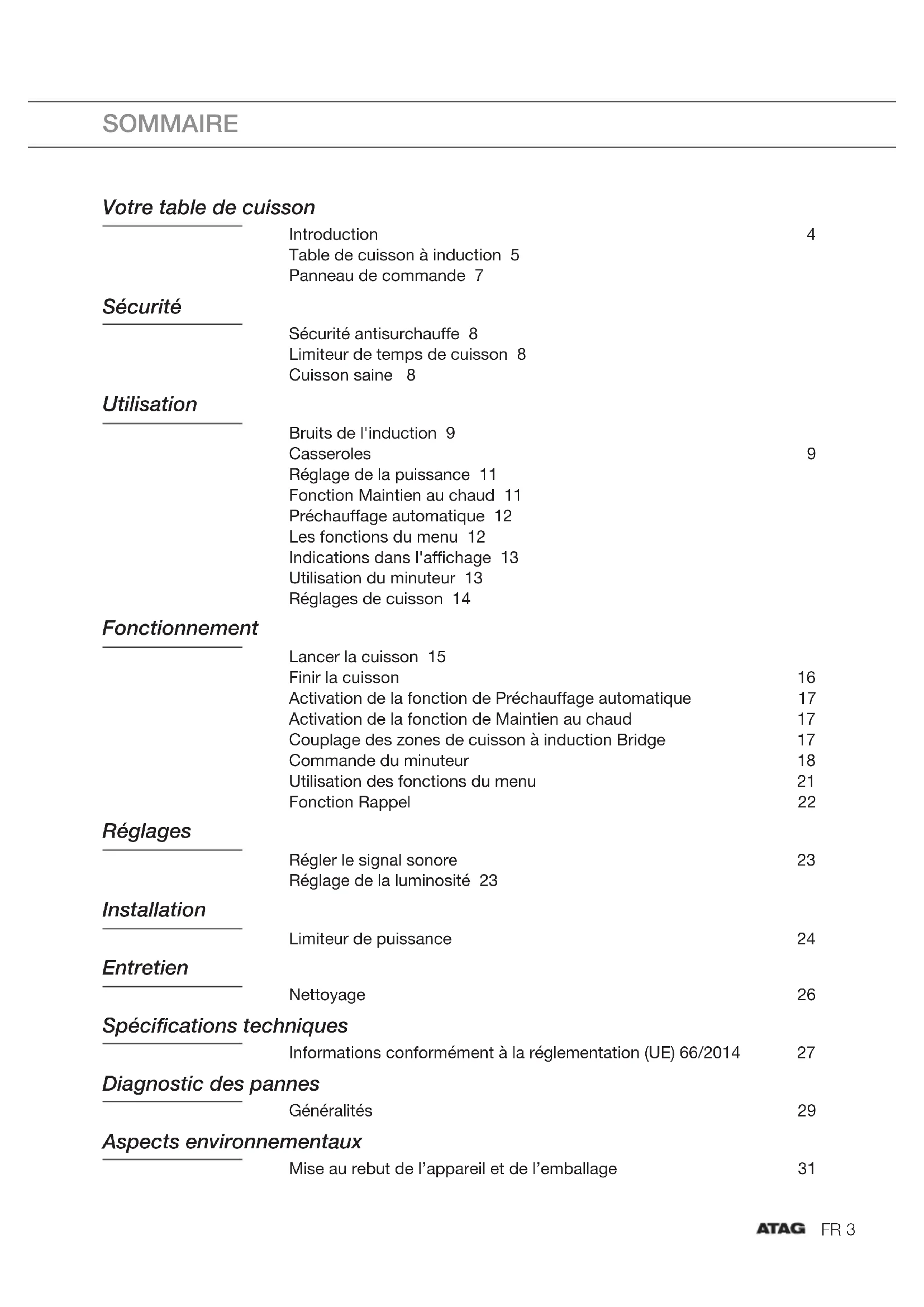 EVNL 4 FR Mode d’emploi FR 3 - FR 31 DE Bedienungsanleitung DE 3 - DE 31 Pictogrammes utilisés – Verwendete Piktogramme Danger! Risque de blessure – Gefahr! Verletzungsgefahr Vorsicht! Gefahr von Schäden am Gerät Attention! Risque de dommages matériels Remarque! – Hinweis!FR 3 SOMMAIRE Votre table de cuisson Introduction 4 Table de cuisson à induction 5 Panneau de commande 7 Sécurité Sécurité antisurchauffe 8 Limiteur de temps de cuisson 8 Cuisson saine 8 Utilisation Bruits de l'induction 9 Casseroles 9 Réglage de la puissance 11 Fonction Maintien au chaud 11 Préchauffage automatique 12 Les fonctions du menu 12 Indications dans l'affichage 13 Utilisation du minuteur 13 Réglages de cuisson 14 Fonctionnement Lancer la cuisson 15 Finir la cuisson 16 Activation de la fonction de Préchauffage automatique 17 Activation de la fonction de Maintien au chaud 17 Couplage des zones de cuisson à induction Bridge 17 Commande du minuteur 18 Utilisation des fonctions du menu 21 Fonction Rappel 22 Réglages Régler le signal sonore 23 Réglage de la luminosité 23 Installation Limiteur de puissance 24 Entretien Nettoyage 26 Spécifications techniques Informations conformément à la réglementation (UE) 66/2014 27 Diagnostic des pannes Généralités 29 Aspects environnementaux Mise au rebut de l’appareil et de l’emballage 31FR 4 Introduction Cette table de cuisson est destinée aux véritables amateurs de cuisine. Cuire sur une table de cuisson à induction présente un certain nombre d’avantages. C’est facile parce que la table de cuisson réagit rapidement et aussi parce qu’il est possible de sélectionner des réglages de très faible puissance. Et comme il est de même possible de sélectionner des réglages très puissants, le point d’ébullition des plats est très vite atteint. L’espace généreux entre les zones de cuisson assure un grand confort d’utilisation. La cuisson sur une table de cuisson à induction est différente de celle sur un appareil conventionnel. La cuisson par induction utilise un champ magnétique pour générer de la chaleur. Vous ne pouvez donc pas utiliser n’importe quelle casserole. Le chapitre Casseroles fournit de plus amples informations à ce sujet. Afin d’assurer une sécurité optimale, la table de cuisson à induction est équipée de plusieurs dispositifs de sécurité thermique et d'un indicateur de chaleur résiduelle. Ce dernier signale les zones de cuisson qui sont encore chaudes. Ce manuel indique comment utiliser la table de cuisson à induction de façon optimale. En plus des informations relatives au fonctionnement du produit, vous y trouverez des renseignements de base susceptibles d'en faciliter l'utilisation. Il contient également des tableaux de cuisson et des conseils d'entretien. Avant d'utiliser l'appareil, lisez attentivement le manuel et rangez-le en lieu sûr pour vous y référer ultérieurement. Le manuel sert également de document de référence pour le service après-vente. Par conséquent, veuillez coller la fiche signalétique de l'appareil dans l'espace prévu à cet effet au verso du manuel. La fiche signalétique de l'appareil contient toutes les informations nécessaires au technicien du service après-vente pour répondre à vos besoins et à vos questions de façon satisfaisante. Les instructions d’installation sont fournies séparément. Nous vous souhaitons bien du plaisir culinaire! Vous pouvez trouver la version la plus récente de le mode d’emploi sur notre site Web.