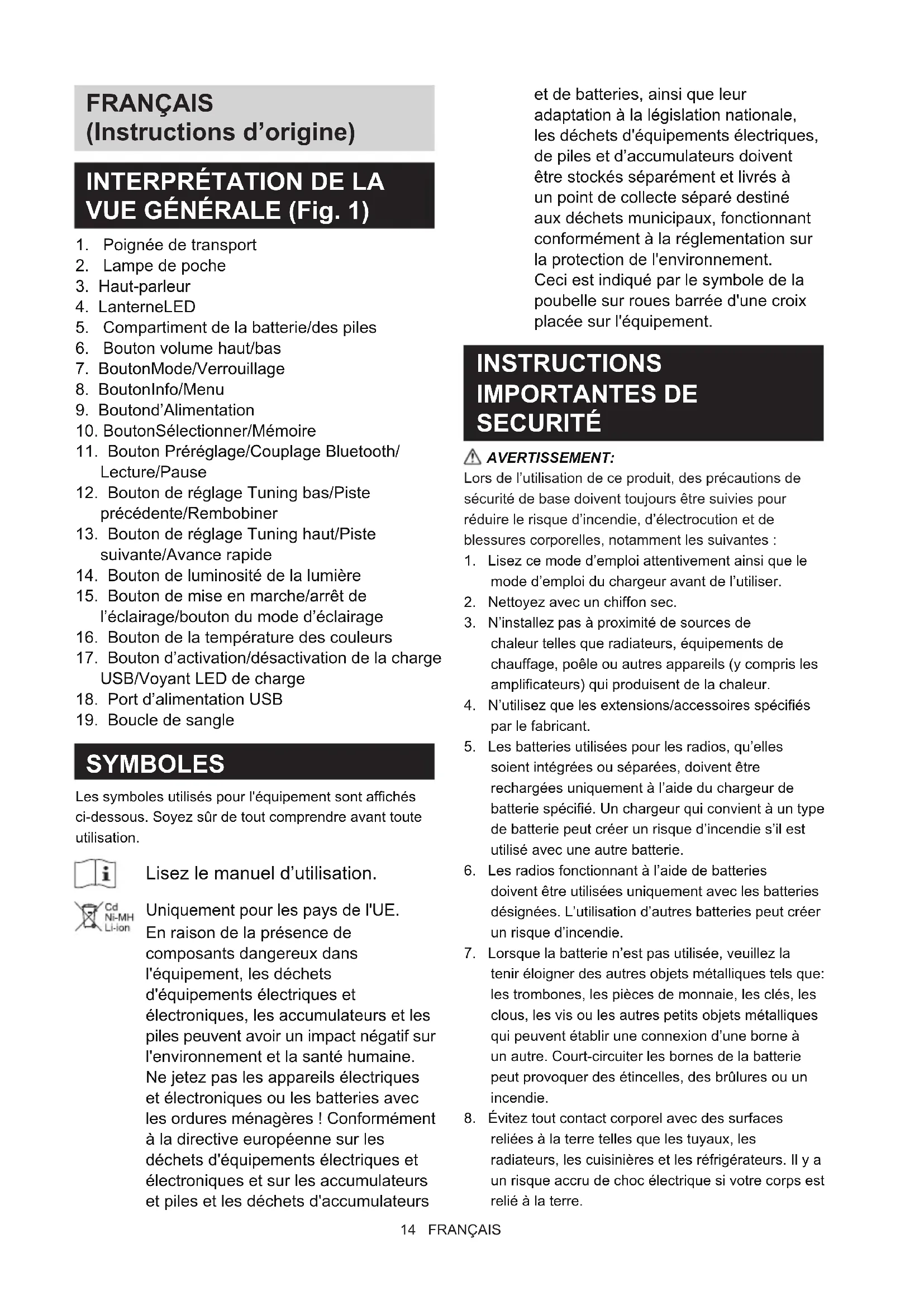verrouillage et maintenez-le enfoncé pendant 2 à 3 secondes jusqu’à ce que « Keys Unlocked » (Déverrouillage des touches) s’affiche à l’écran. Utilisation de la sangle (Fig. 6) À l'aide de la sangle fournie, vous pouvez accrocher le produit de différentes manières chaque fois que vous en avez besoin. (Reportez-vous à la méthode d'installation de la Figure 6.) ENTRETIEN MISE EN GARDE: ● N’utilisez jamais d’essence, de benzine, de diluant, d’alcool ou produits similaires. Cela pourrait entraîner une décoloration, une déformation ou des fissures. ● Ne lavez pas la radio avec de l’eau.24 DEUTSCH DEUTSCH (Originalanweisungen) Übersicht des Geräts (Abb. 1)