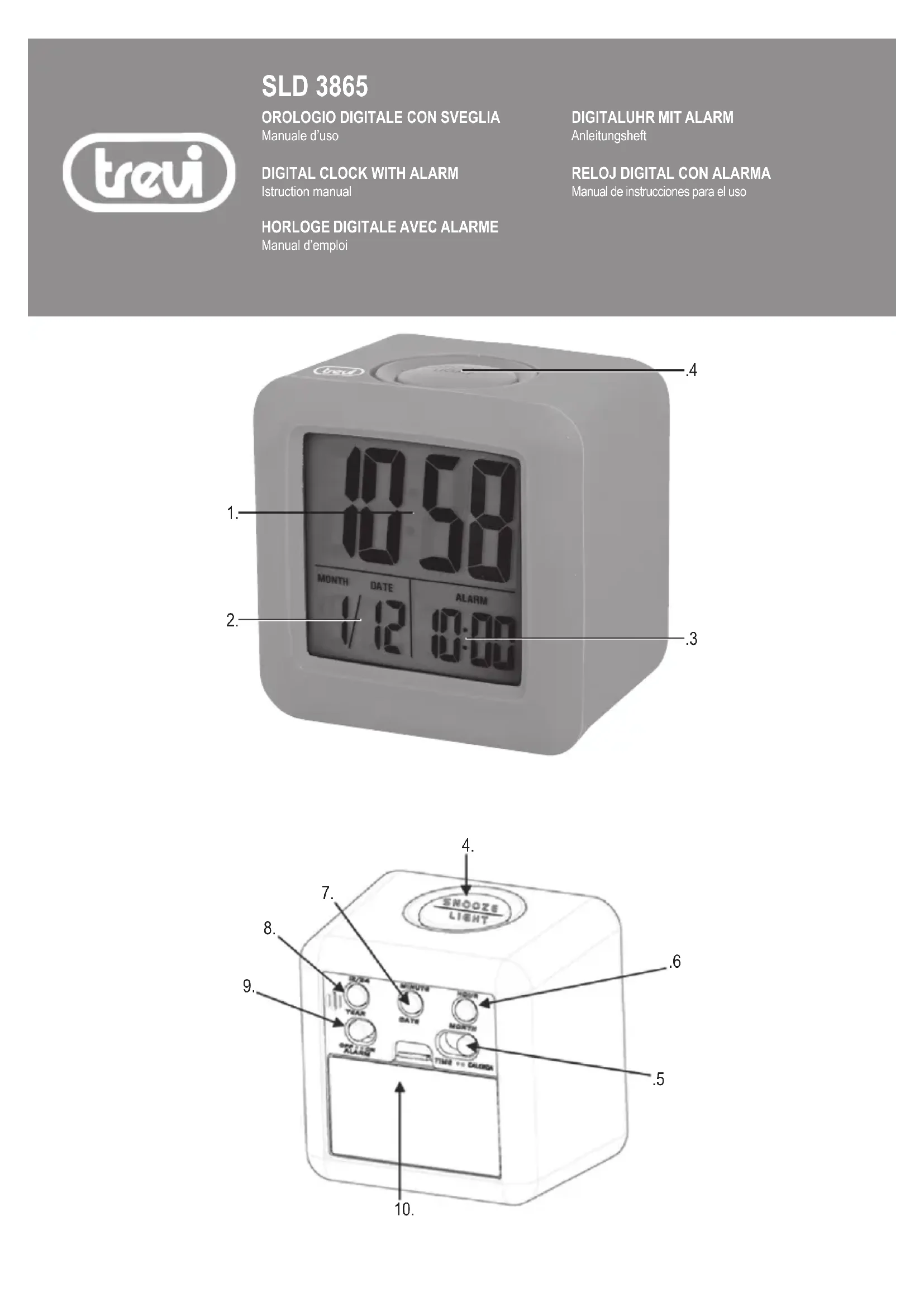 4. Bouton SNOOZE/LIGHT, temporairement arrêter l’alarme, ou éclairer