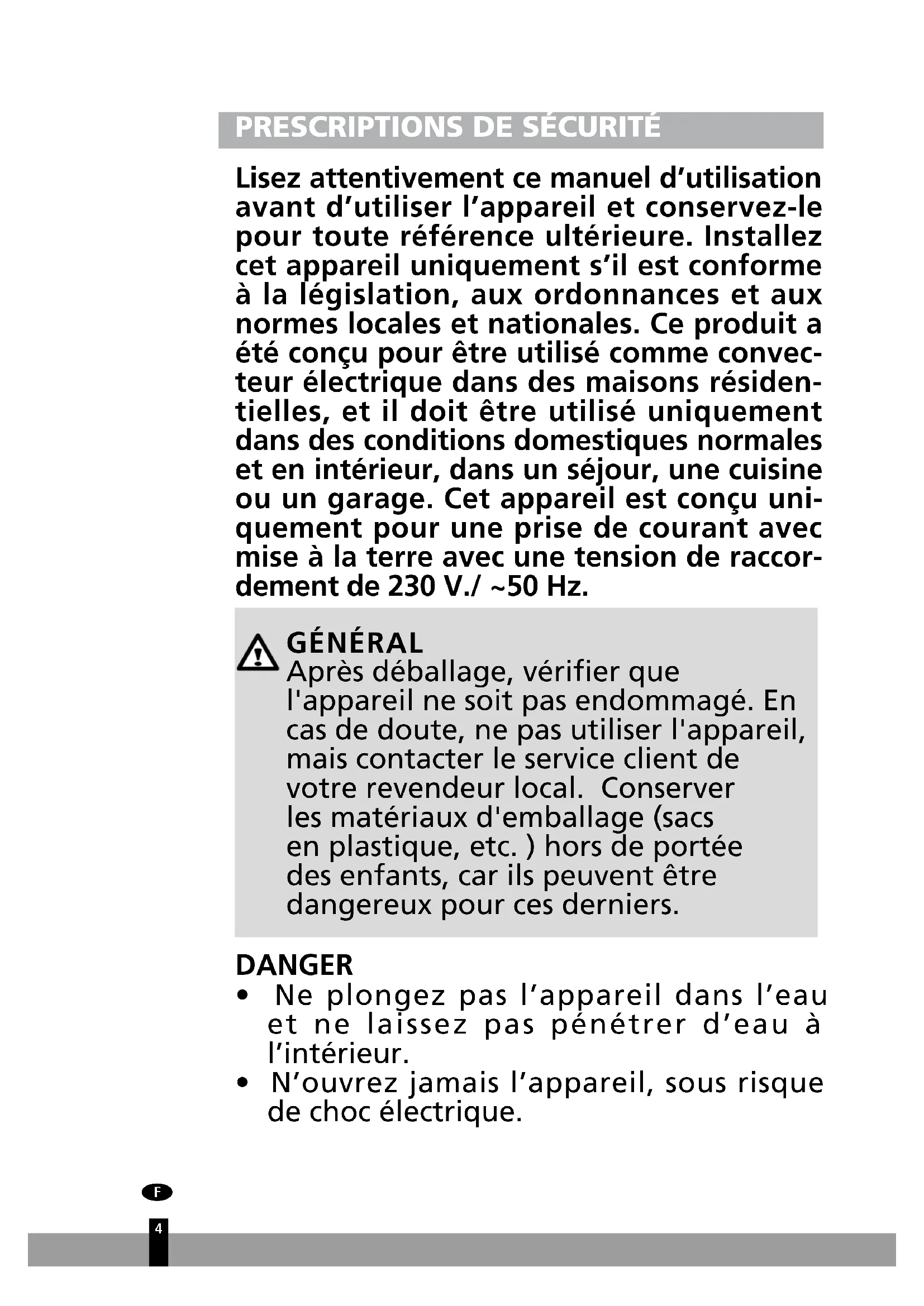 Lisez attentivement ce manuel d’utilisation avant d’utiliser l’appareil et conservez-le pour toute référence ultérieure. Installez cet appareil uniquement s’il est conforme à la législation, aux ordonnances et aux normes locales et nationales. Ce produit a été conçu pour être utilisé comme convec- teur électrique dans des maisons résiden- tielles, et il doit être utilisé uniquement dans des conditions domestiques normales et en intérieur, dans un séjour, une cuisine ou un garage. Cet appareil est conçu uni- quement pour une prise de courant avec mise à la terre avec une tension de raccor- dement de 230 V./ ~50 Hz.