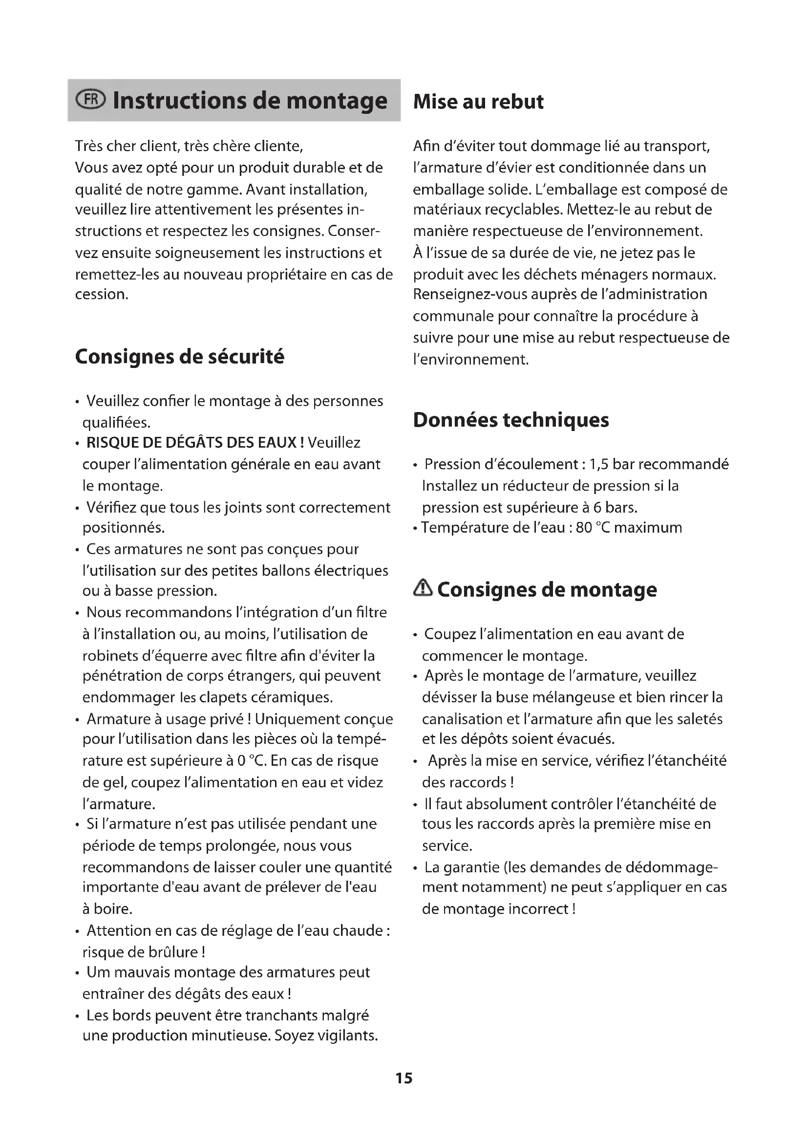 - Um mauvais montage des armatures peut entraîner des dégâts des eaux !