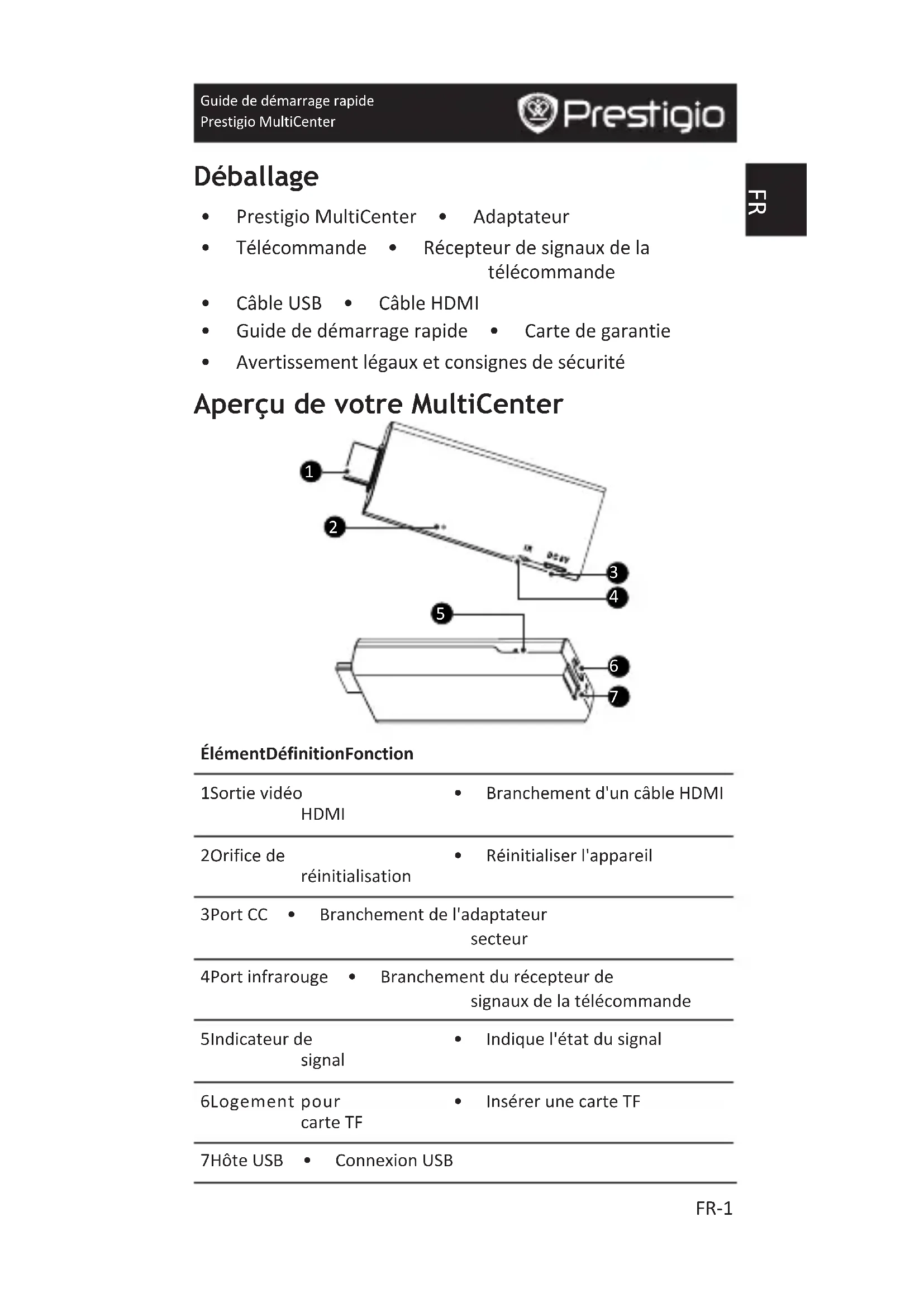 - InsérerunecarteTF 7 HôteUSB • ConnexionUSB PAD2411 QSG.indd 35 2013/12/16 15:35:13FR Guide de démarrage rapide Prestigio MultiCenter FR-2 Aperçu de la télécommande